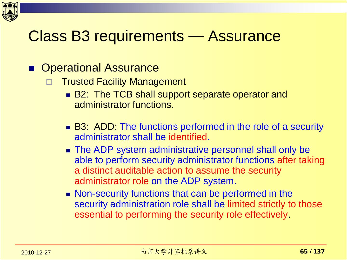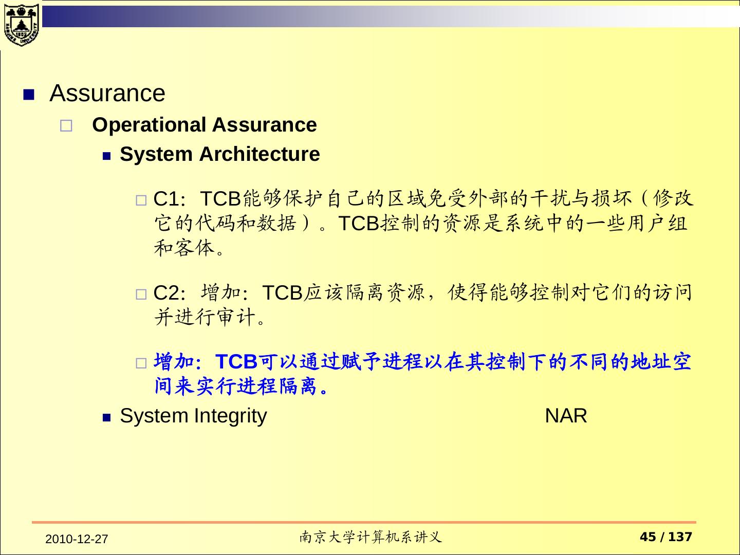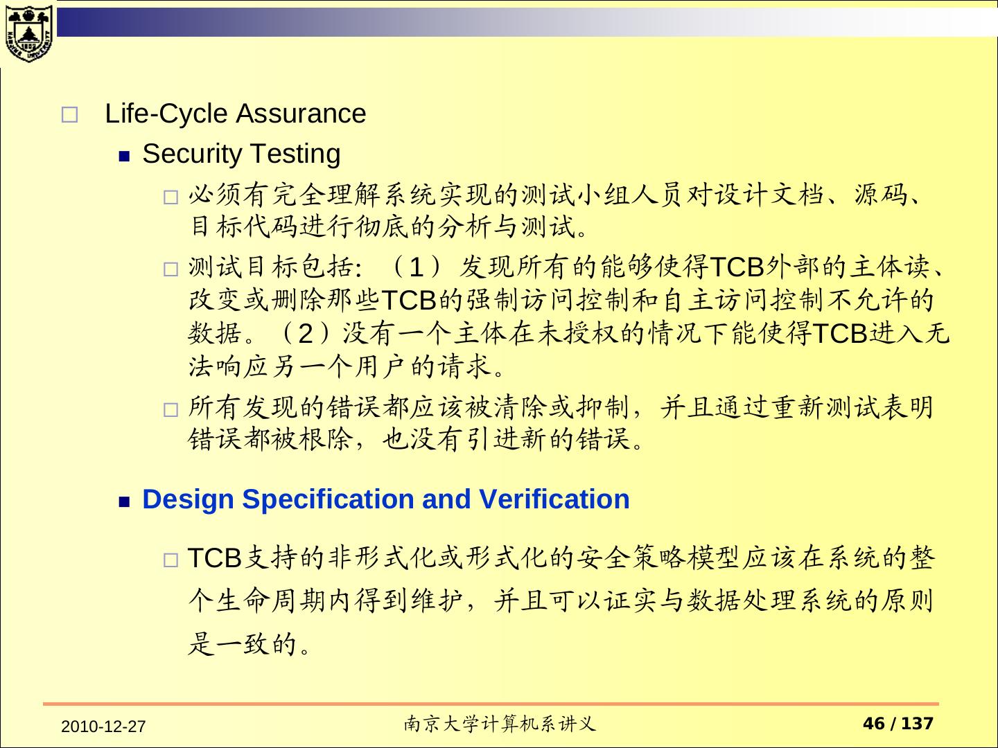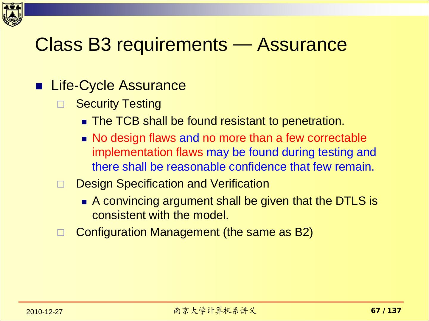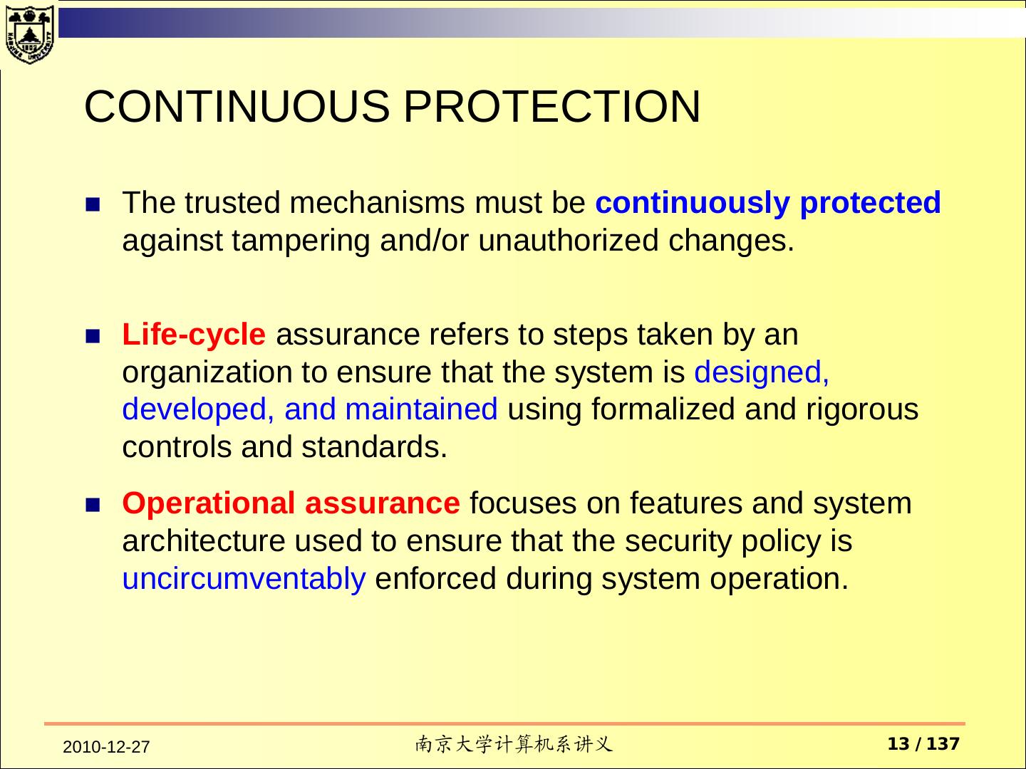 12 . ASSURANCE In order to assure that the four requirements are enforced by a computer system, there must be some identified and unified collection of hardware and software controls that perform those functions. The basis for trusting such system mechanisms in their operational setting must be clearly documented such that it is possible to independently examine the evidence to evaluate their sufficiency. 2010-12-27 南京大学计算机系讲义 12 / 137