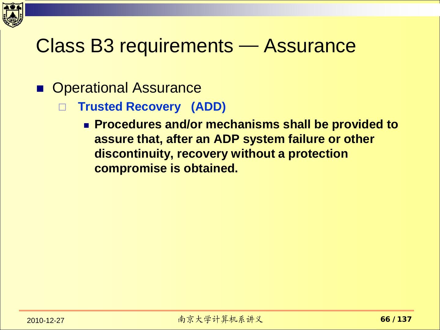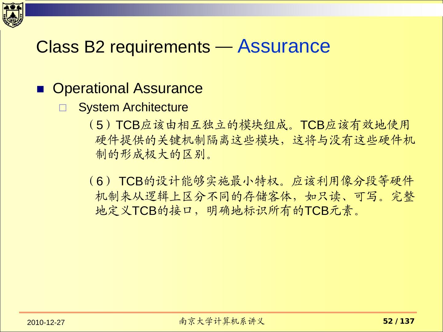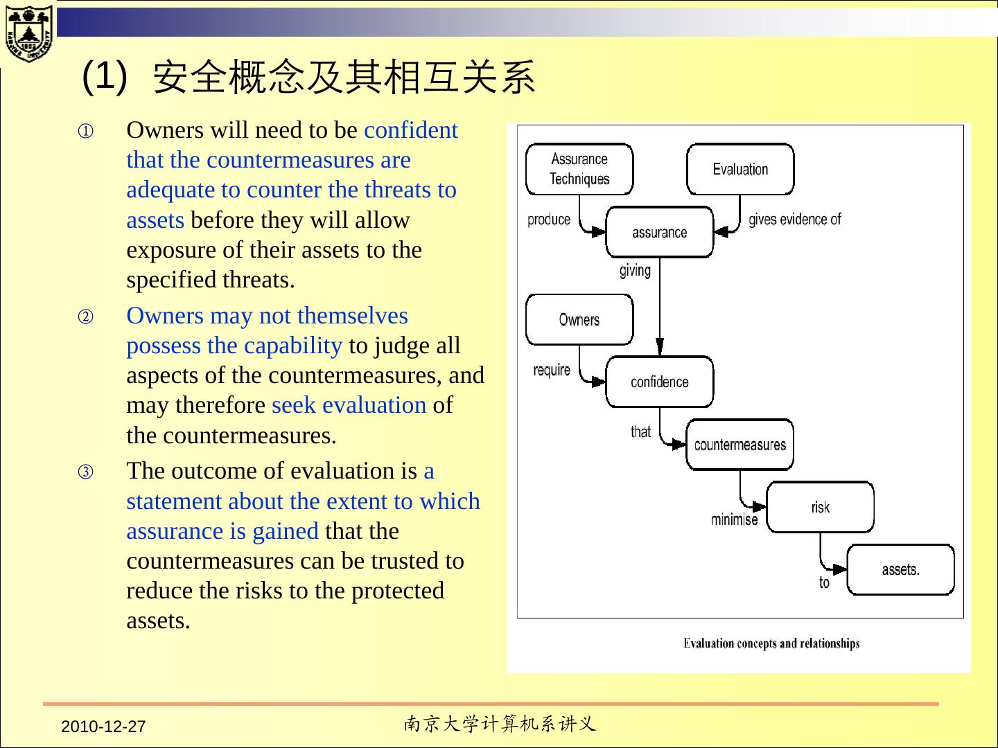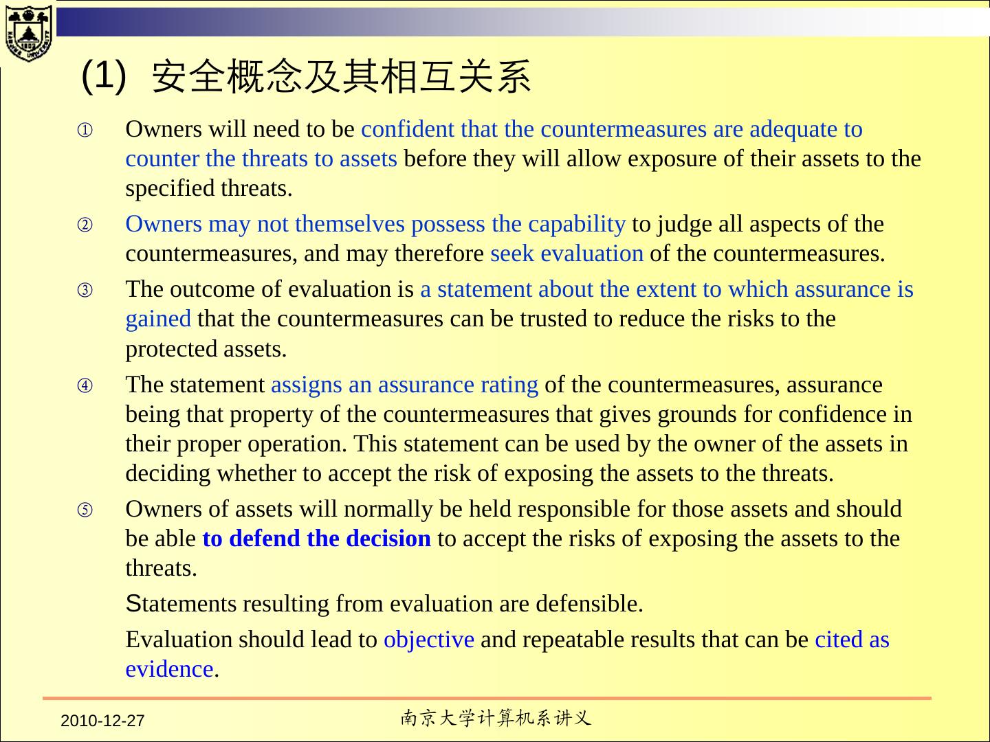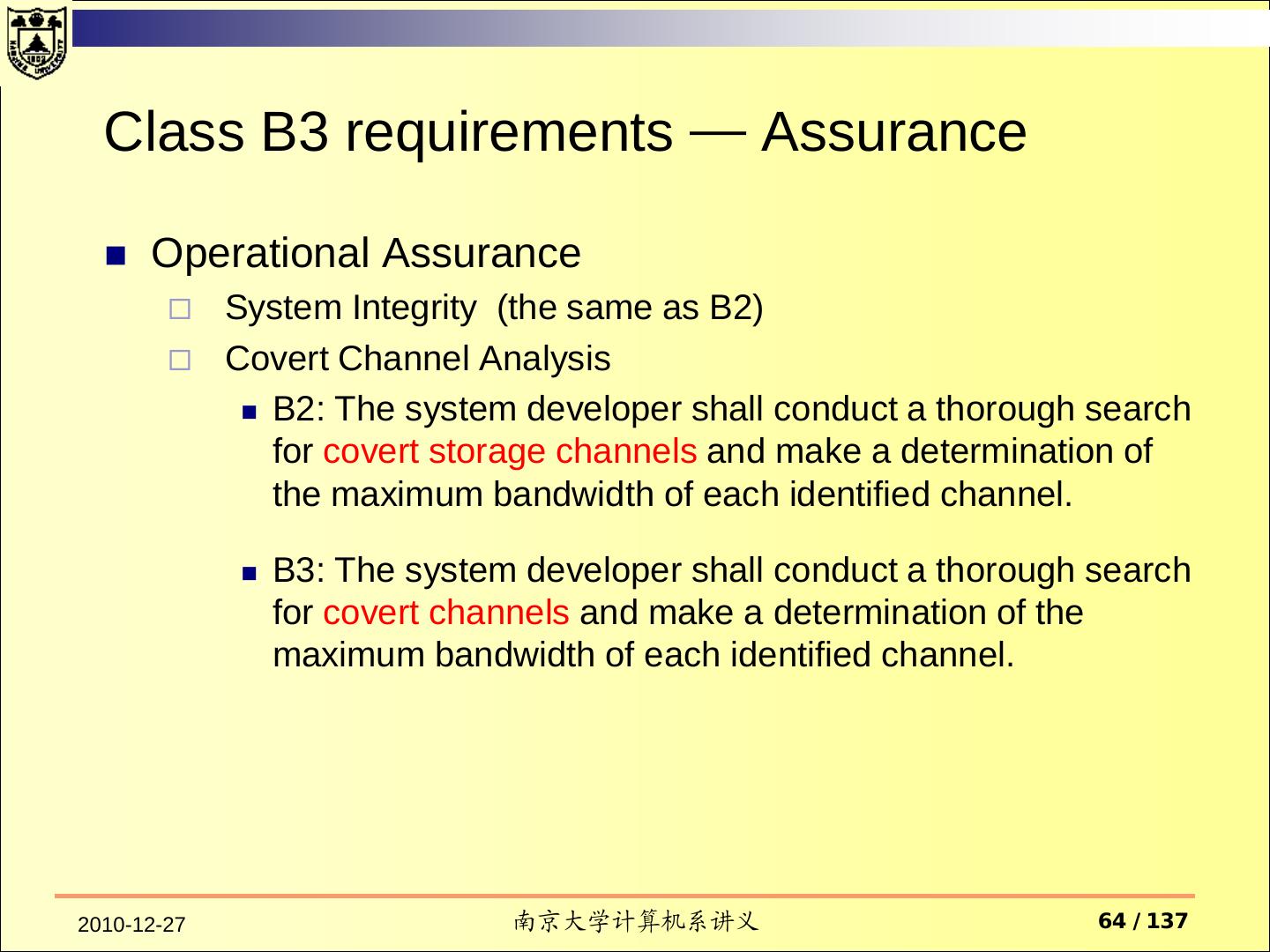 12 . ASSURANCE In order to assure that the four requirements are enforced by a computer system, there must be some identified and unified collection of hardware and software controls that perform those functions. The basis for trusting such system mechanisms in their operational setting must be clearly documented such that it is possible to independently examine the evidence to evaluate their sufficiency. 2010-12-27 南京大学计算机系讲义 12 / 137