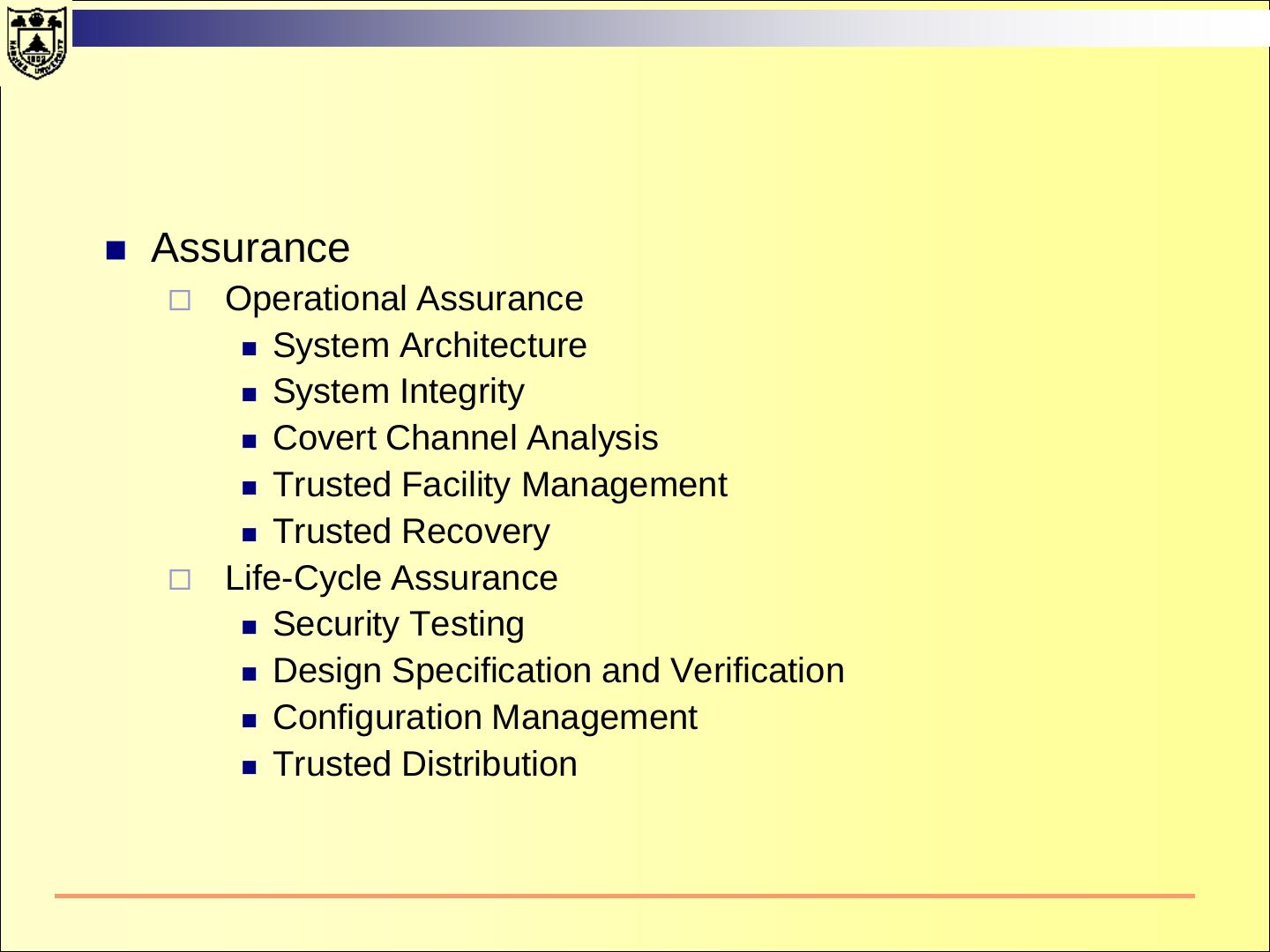 14 . Assurance Operational Assurance System Architecture System Integrity Covert Channel Analysis Trusted Facility Management Trusted Recovery Life-Cycle Assurance Security Testing Design Specification and Verification Configuration Management Trusted Distribution