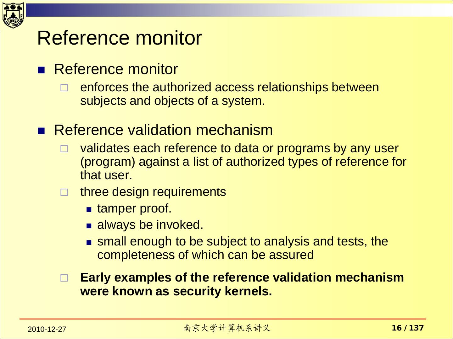 16 . Reference monitor Reference monitor enforces the authorized access relationships between subjects and objects of a system. Reference validation mechanism validates each reference to data or programs by any user (program) against a list of authorized types of reference for that user. three design requirements tamper proof. always be invoked. small enough to be subject to analysis and tests, the completeness of which can be assured Early examples of the reference validation mechanism were known as security kernels. 2010-12-27 南京大学计算机系讲义 16 / 137
