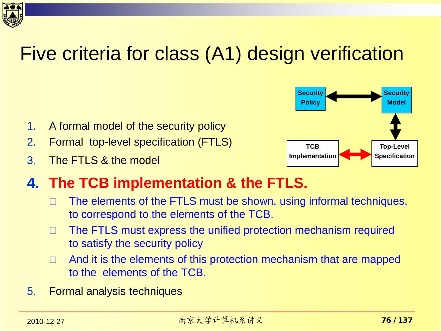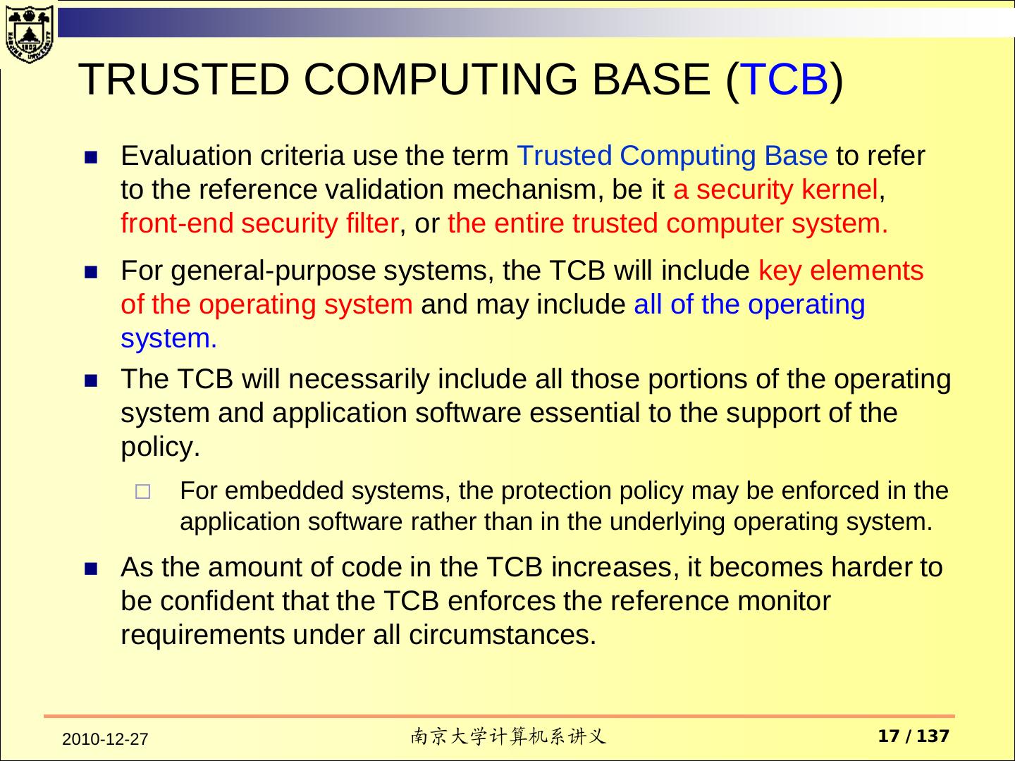 17 . TRUSTED COMPUTING BASE (TCB) Evaluation criteria use the term Trusted Computing Base to refer to the reference validation mechanism, be it a security kernel, front-end security filter, or the entire trusted computer system. For general-purpose systems, the TCB will include key elements of the operating system and may include all of the operating system. The TCB will necessarily include all those portions of the operating system and application software essential to the support of the policy. For embedded systems, the protection policy may be enforced in the application software rather than in the underlying operating system. As the amount of code in the TCB increases, it becomes harder to be confident that the TCB enforces the reference monitor requirements under all circumstances. 2010-12-27 南京大学计算机系讲义 17 / 137