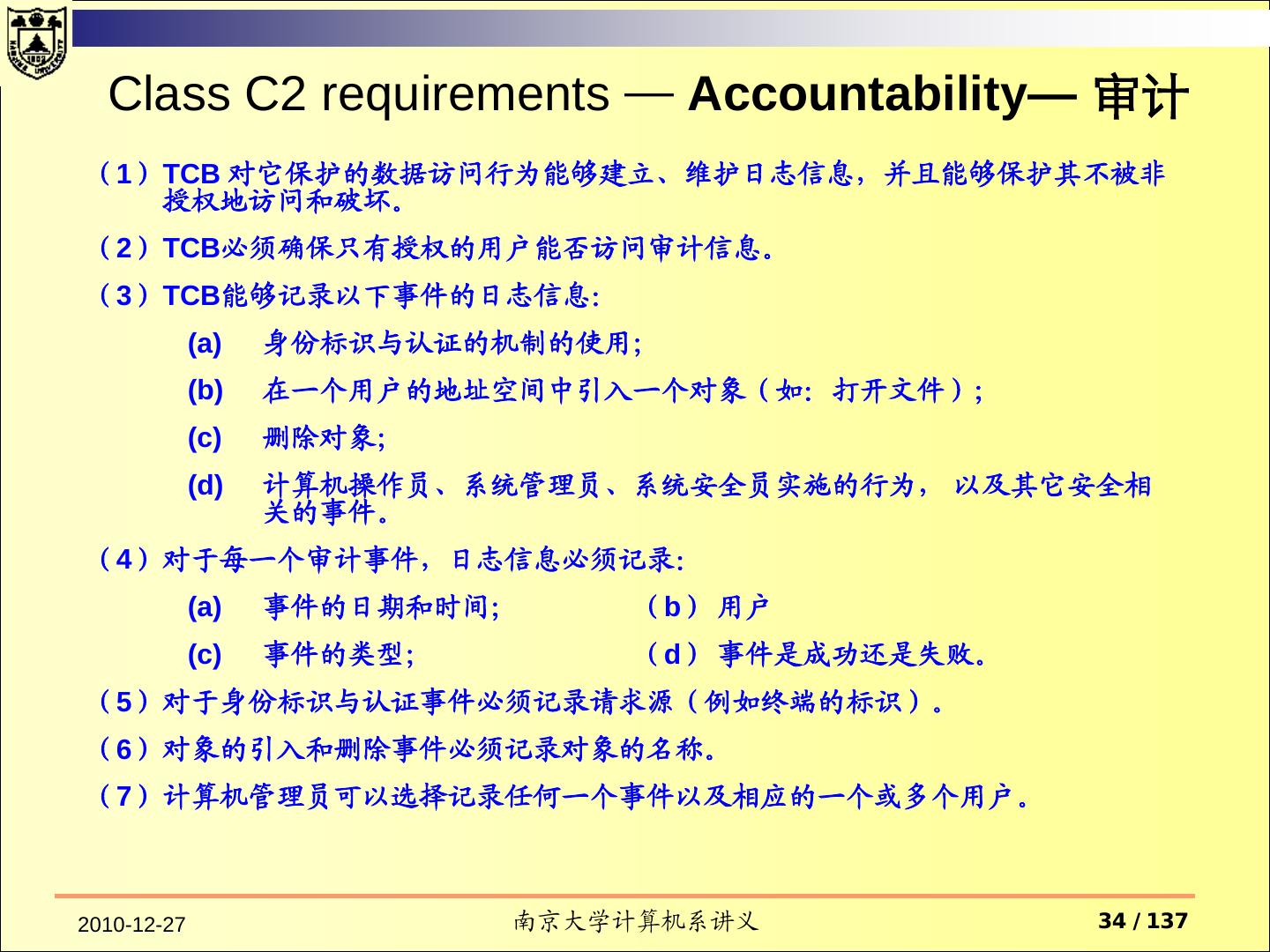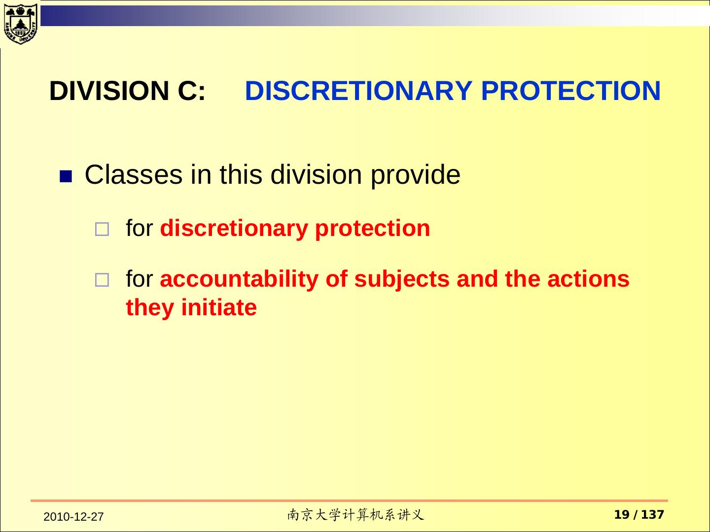 19 .DIVISION C: DISCRETIONARY PROTECTION Classes in this division provide for discretionary protection for accountability of subjects and the actions they initiate 2010-12-27 南京大学计算机系讲义 19 / 137