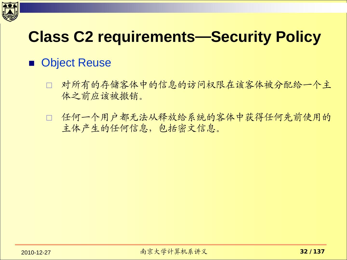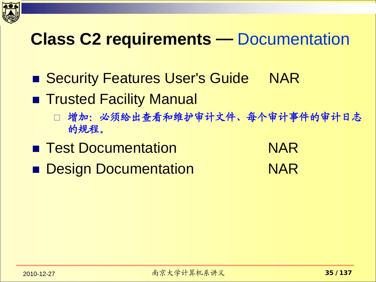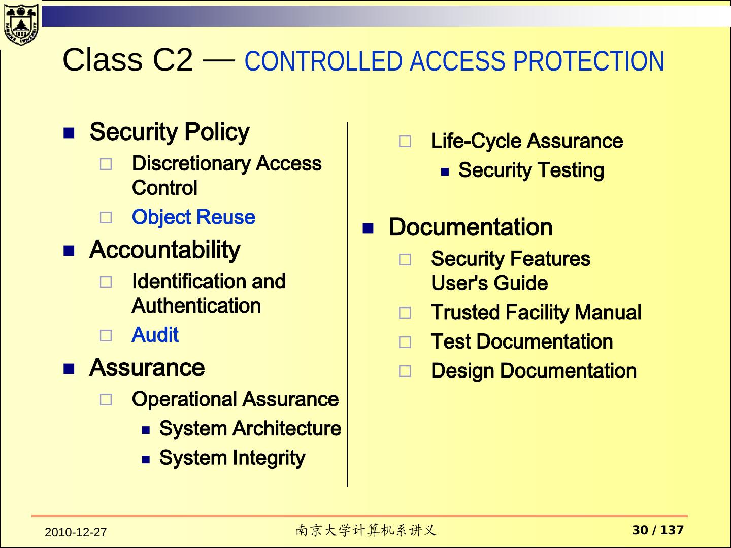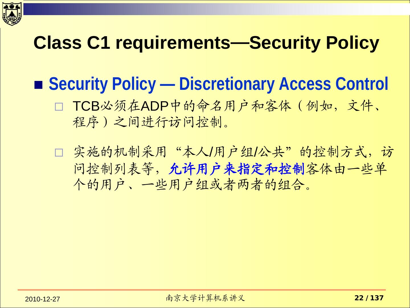 21 . Class C1 requirements Security Policy Documentation Discretionary Access Security Features User's Guide Control Trusted Facility Manual Accountability Test Documentation Identification and Design Documentation Authentication Assurance Operational Assurance System Architecture System Integrity Life-Cycle Assurance Security Testing 2010-12-27 南京大学计算机系讲义 21 / 137