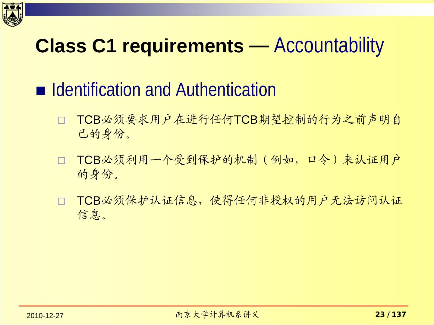 22 . Class C1 requirements—Security Policy Security Policy — Discretionary Access Control TCB必须在ADP中的命名用户和客体(例如,文件、 程序)之间进行访问控制。 实施的机制采用“本人/用户组/公共”的控制方式,访 问控制列表等,允许用户来指定和控制客体由一些单 个的用户、一些用户组或者两者的组合。 2010-12-27 南京大学计算机系讲义 22 / 137