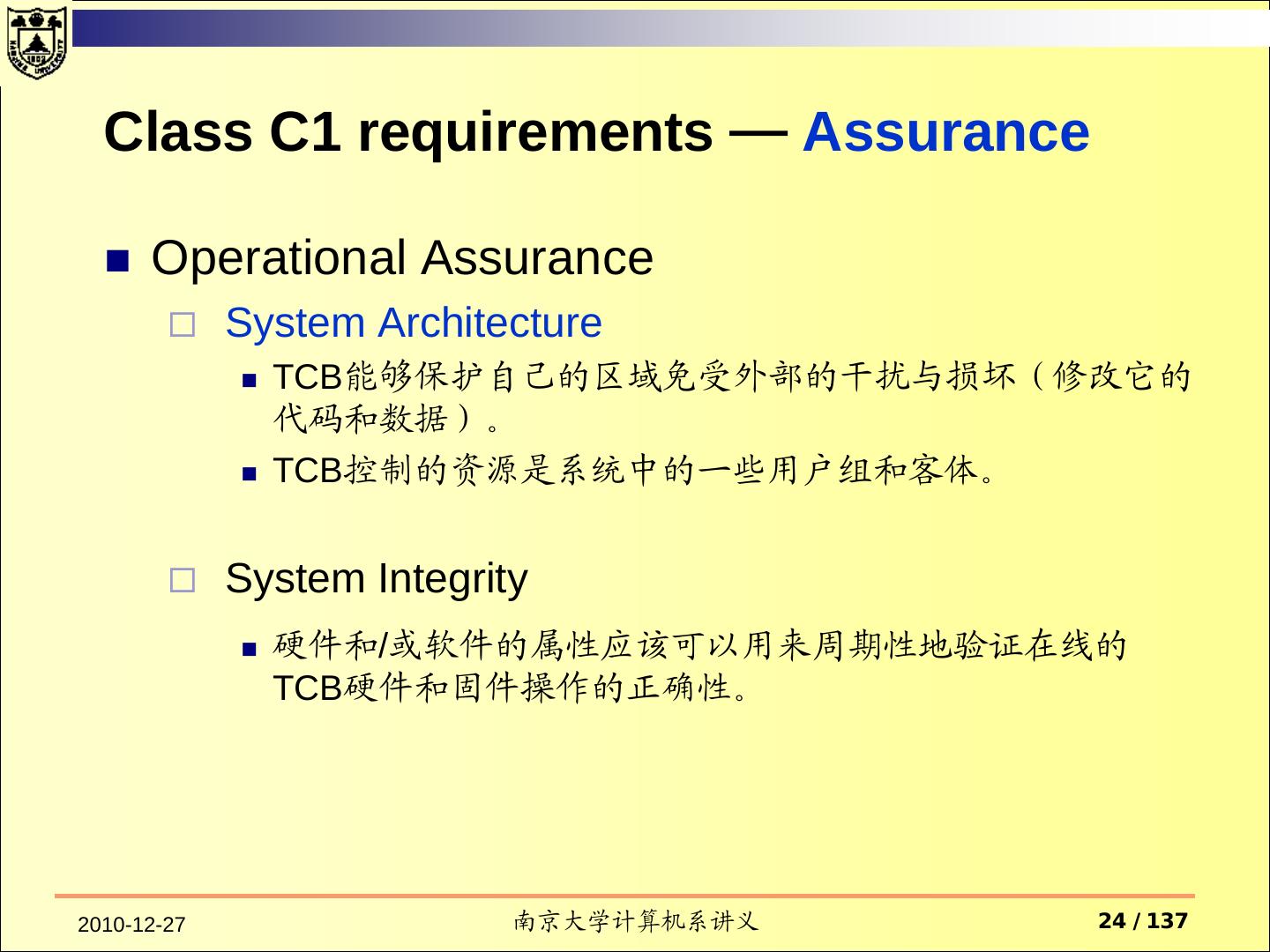 23 . Class C1 requirements — Accountability Identification and Authentication TCB必须要求用户在进行任何TCB期望控制的行为之前声明自 己的身份。 TCB必须利用一个受到保护的机制(例如,口令)来认证用户 的身份。 TCB必须保护认证信息,使得任何非授权的用户无法访问认证 信息。 2010-12-27 南京大学计算机系讲义 23 / 137