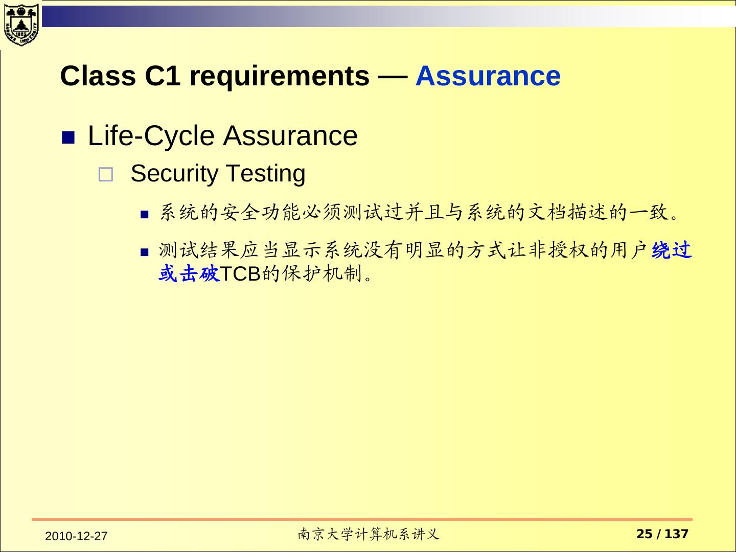 24 . Class C1 requirements — Assurance Operational Assurance System Architecture TCB能够保护自己的区域免受外部的干扰与损坏(修改它的 代码和数据)。 TCB控制的资源是系统中的一些用户组和客体。 System Integrity 硬件和/或软件的属性应该可以用来周期性地验证在线的 TCB硬件和固件操作的正确性。 2010-12-27 南京大学计算机系讲义 24 / 137