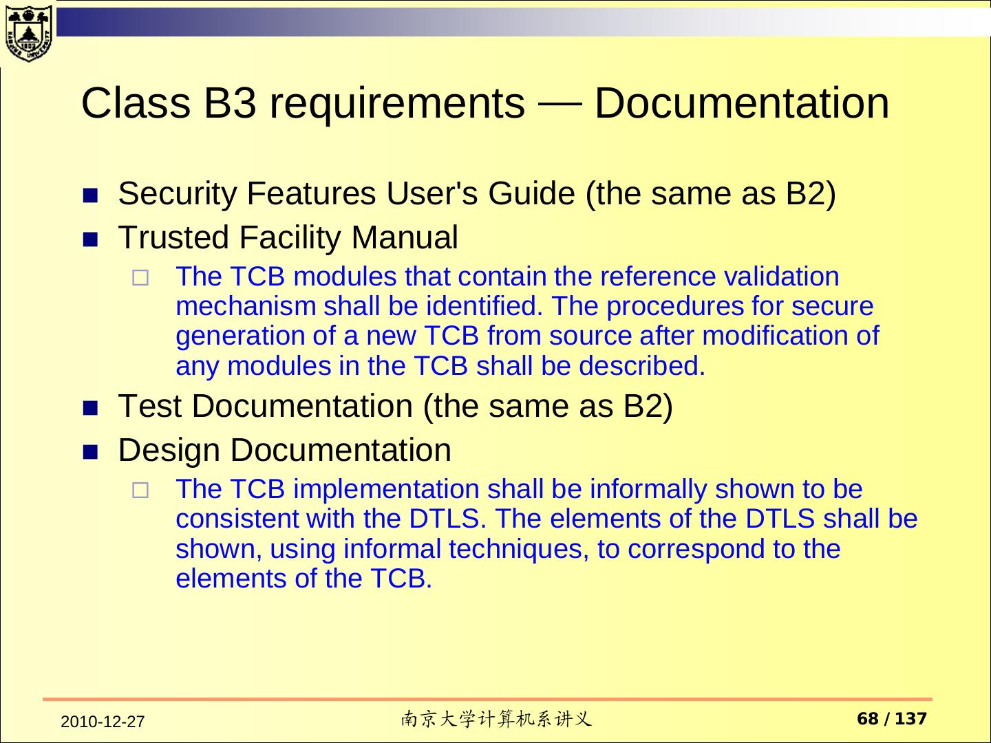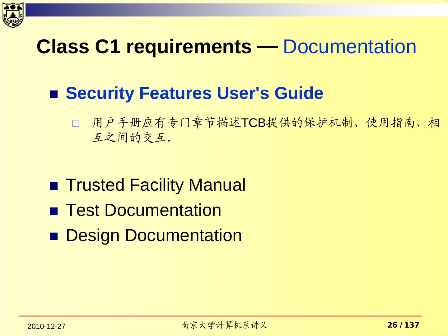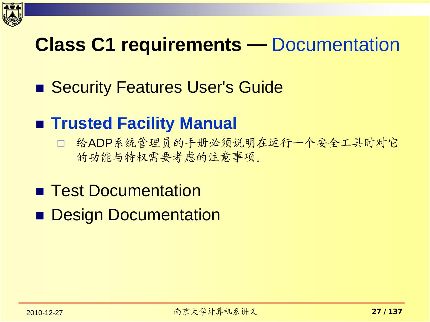 26 . Class C1 requirements — Documentation Security Features User's Guide 用户手册应有专门章节描述TCB提供的保护机制、使用指南、相 互之间的交互。 Trusted Facility Manual Test Documentation Design Documentation 2010-12-27 南京大学计算机系讲义 26 / 137