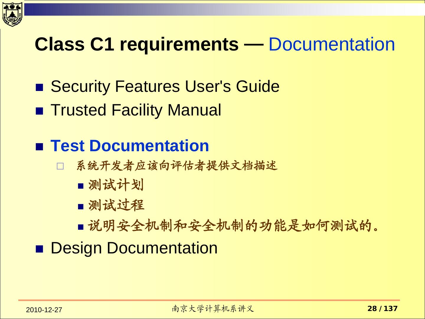 27 . Class C1 requirements — Documentation Security Features User's Guide Trusted Facility Manual 给ADP系统管理员的手册必须说明在运行一个安全工具时对它 的功能与特权需要考虑的注意事项。 Test Documentation Design Documentation 2010-12-27 南京大学计算机系讲义 27 / 137
