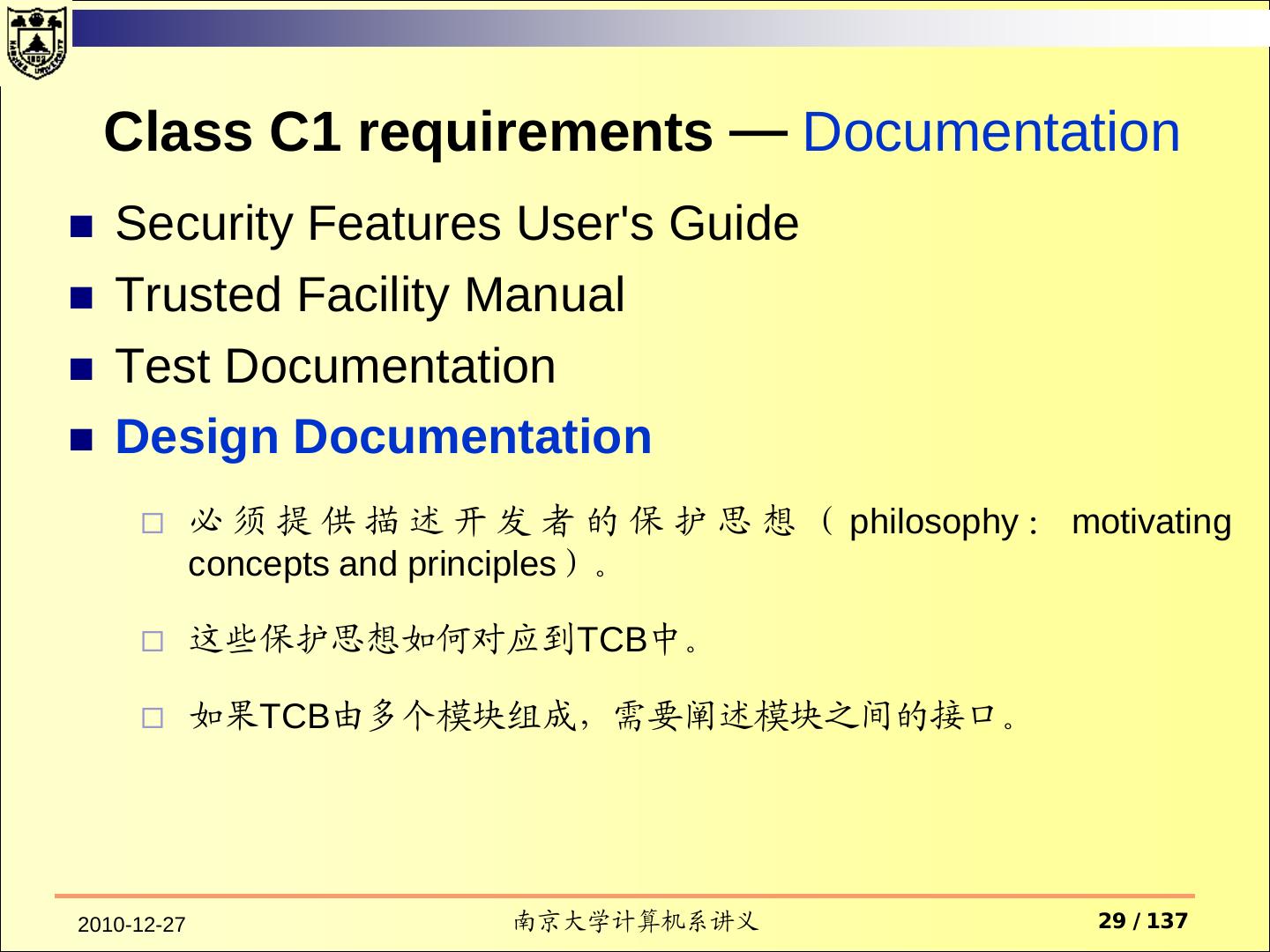 28 . Class C1 requirements — Documentation Security Features User's Guide Trusted Facility Manual Test Documentation 系统开发者应该向评估者提供文档描述 测试计划 测试过程 说明安全机制和安全机制的功能是如何测试的。 Design Documentation 2010-12-27 南京大学计算机系讲义 28 / 137