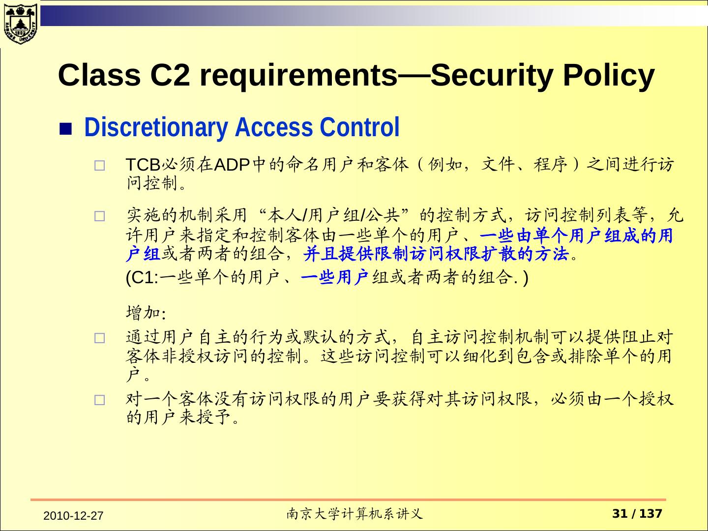 20 . CLASS C1 DISCRETIONARY SECURITY PROTECTION The class (C1) environment is expected to be one of cooperating users processing data at the same level(s) of sensitivity. 2010-12-27 南京大学计算机系讲义 20 / 137