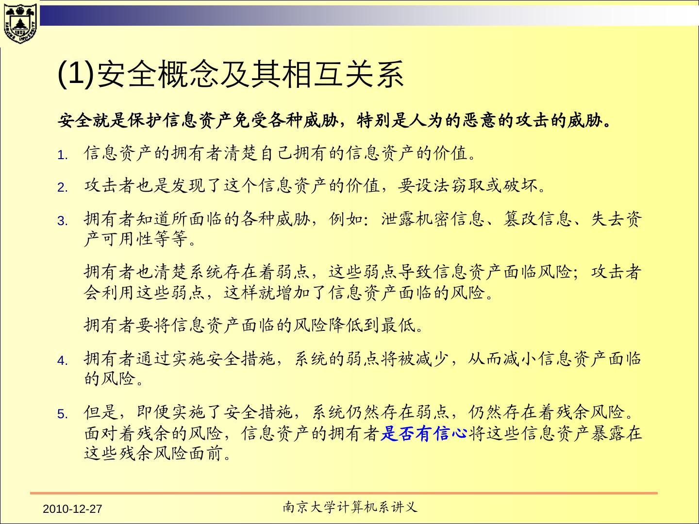 7 . Fundamental Computer Security Requirements Policy Accountability Assurance Documentation 2010-12-27 南京大学计算机系讲义 7 / 137
