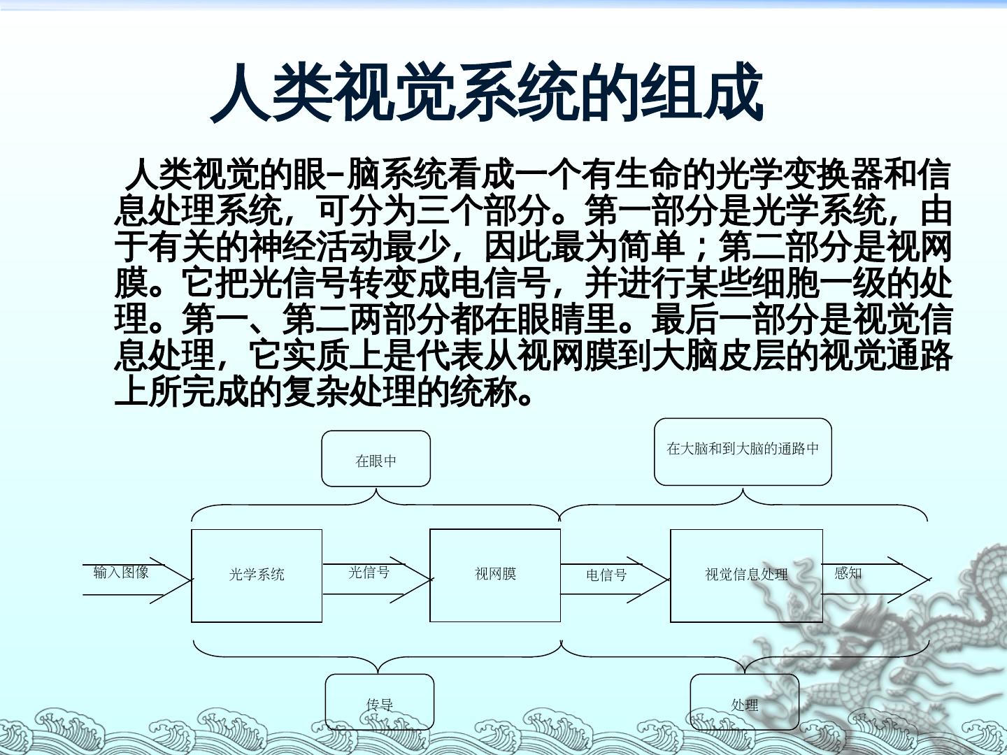 4 . 1.1 人类生理视觉系统 人类所有的感觉当中,视觉具有特别重要 的意义。研究表明, 80% 以上的外界信息 是由视觉系统所接收、处理和感知的; 视觉系统所具有的各种功能使我们能够分 辨万物,感知它们的大小、形状、颜色、 亮暗、远近和动静; 人类的视觉系统事实上指的就是眼—脑系 统。眼—脑系统在完成上述这些视觉功能 时涉及不同的视觉信息处理过程。