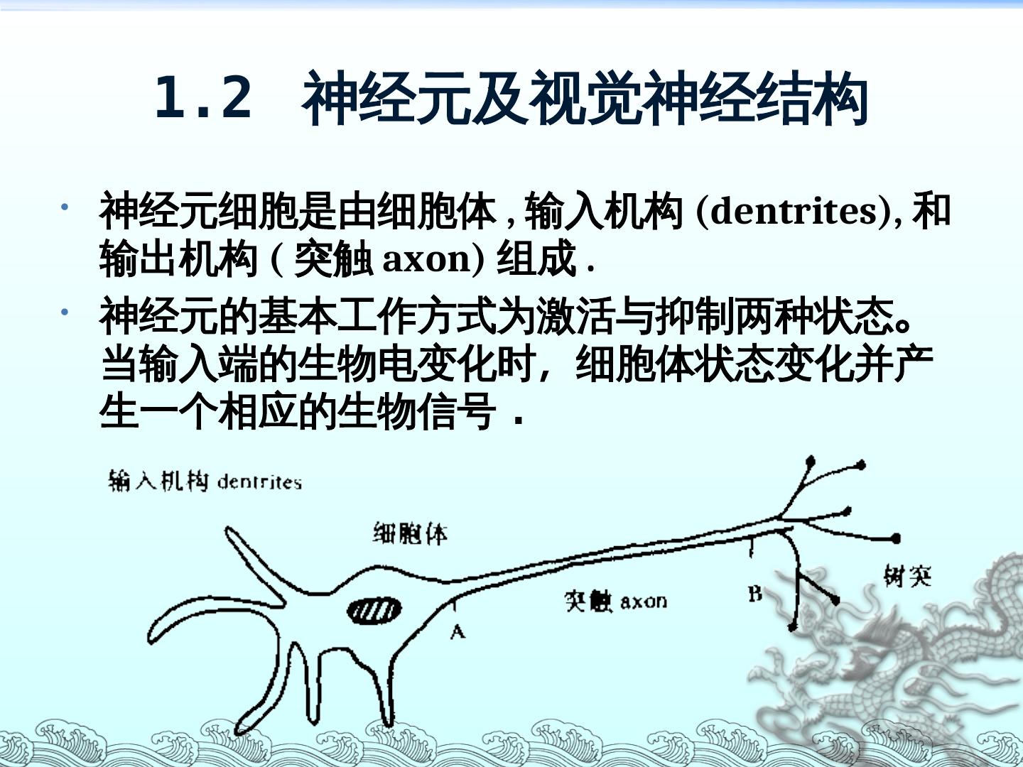 11 . 1.2 神经元及视觉神经结构 神经元细胞是由细胞体 , 输入机构 (dentrites),dentrites),), 和 输出机构 (dentrites), 突触 axon) 组成 . 神经元的基本工作方式为激活与抑制两种状态。 当输入端的生物电变化时,细胞体状态变化并产 生一个相应的生物信号 .
