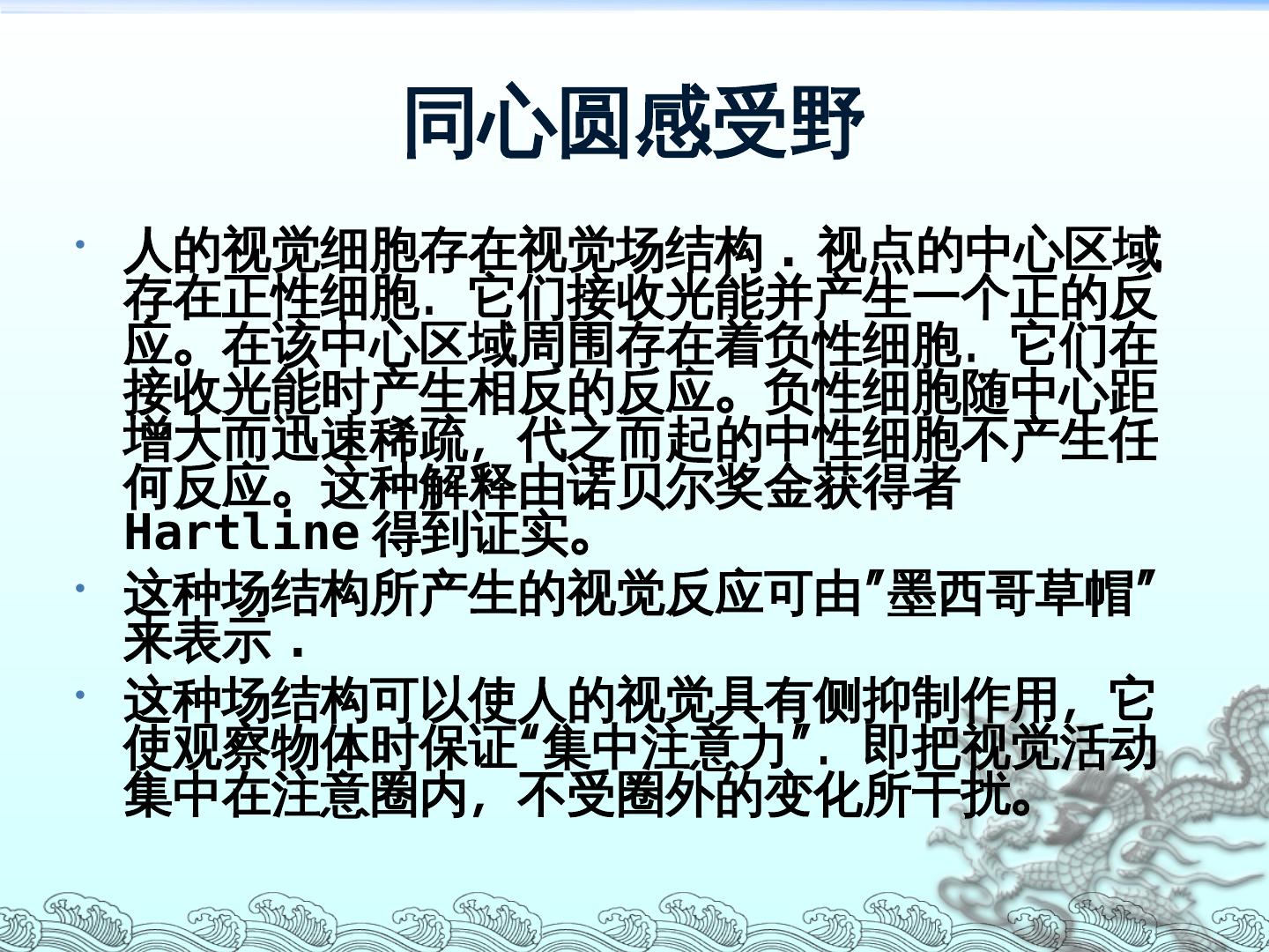 16 . 同心圆感受野 人的视觉细胞存在视觉场结构 . 视点的中心区域 存在正性细胞.它们接收光能并产生一个正的反 应。在该中心区域周围存在着负性细胞.它们在 接收光能时产生相反的反应。负性细胞随中心距 增大而迅速稀疏,代之而起的中性细胞不产生任 何反应。这种解释由诺贝尔奖金获得者 Hartline 得到证实。 这种场结构所产生的视觉反应可由”墨西哥草帽” 来表示 . 这种场结构可以使人的视觉具有侧抑制作用,它 使观察物体时保证“集中注意力”.即把视觉活动 集中在注意圈内,不受圈外的变化所干扰。