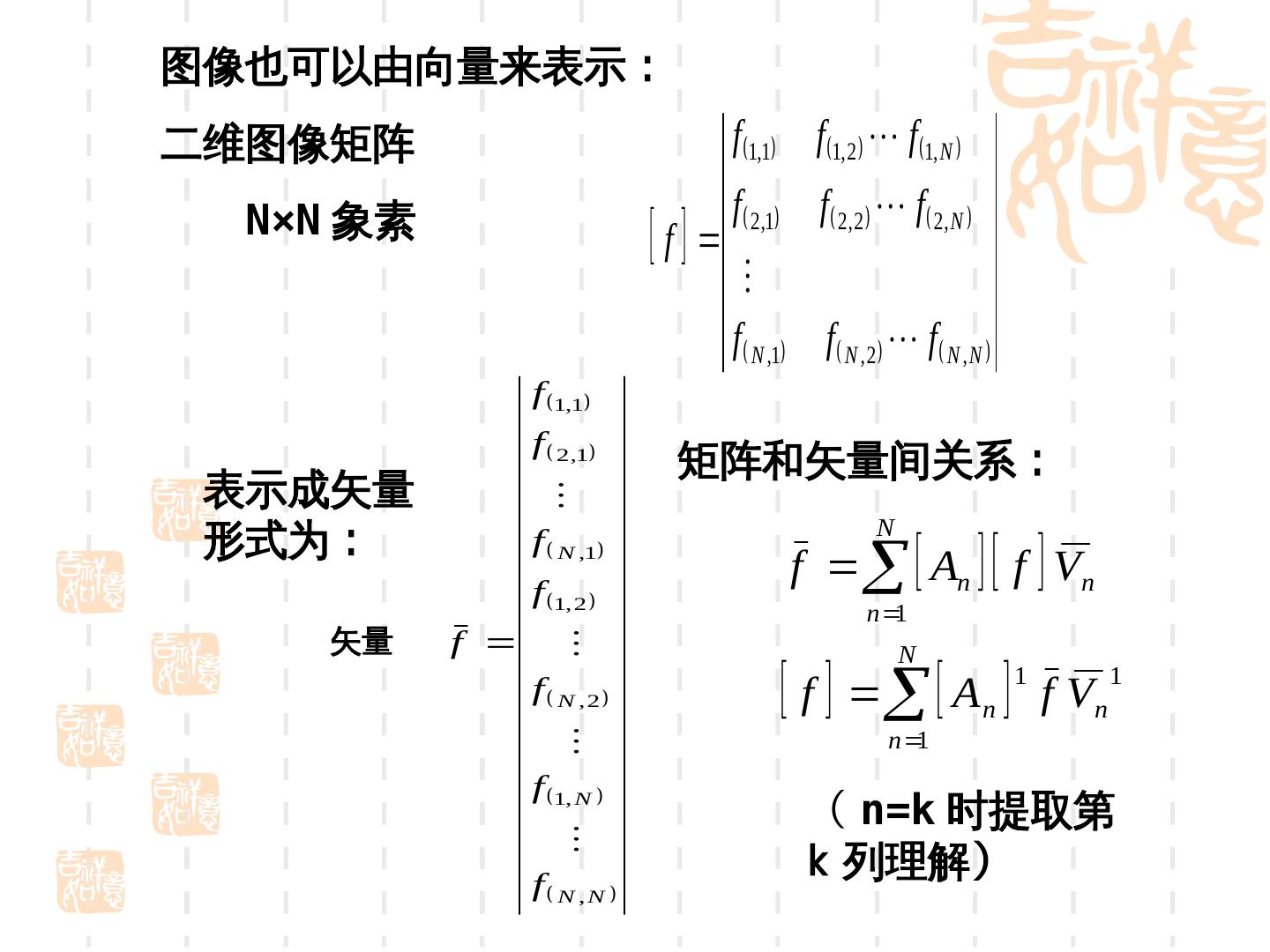 14 .图像也可以由向量来表示:电荷耦合器件 二维图像矩阵 f 1,1 f 1, 2 f 1, N N×N 象素 f 2,1 f 2,2 f 2, N f f N ,1 f N , 2 f N , N f 1,1 f 2 ,1 矩阵和矢量间关系:电荷耦合器件 表示成矢量 N 形式为:电荷耦合器件 f N ,1 f An f Vn f 1, 2 n 1 矢量 f N f N ,2 f A n 1 f V n 1 n 1 f 1, N ( n=k 时提取第 f N ,N k 列理解)