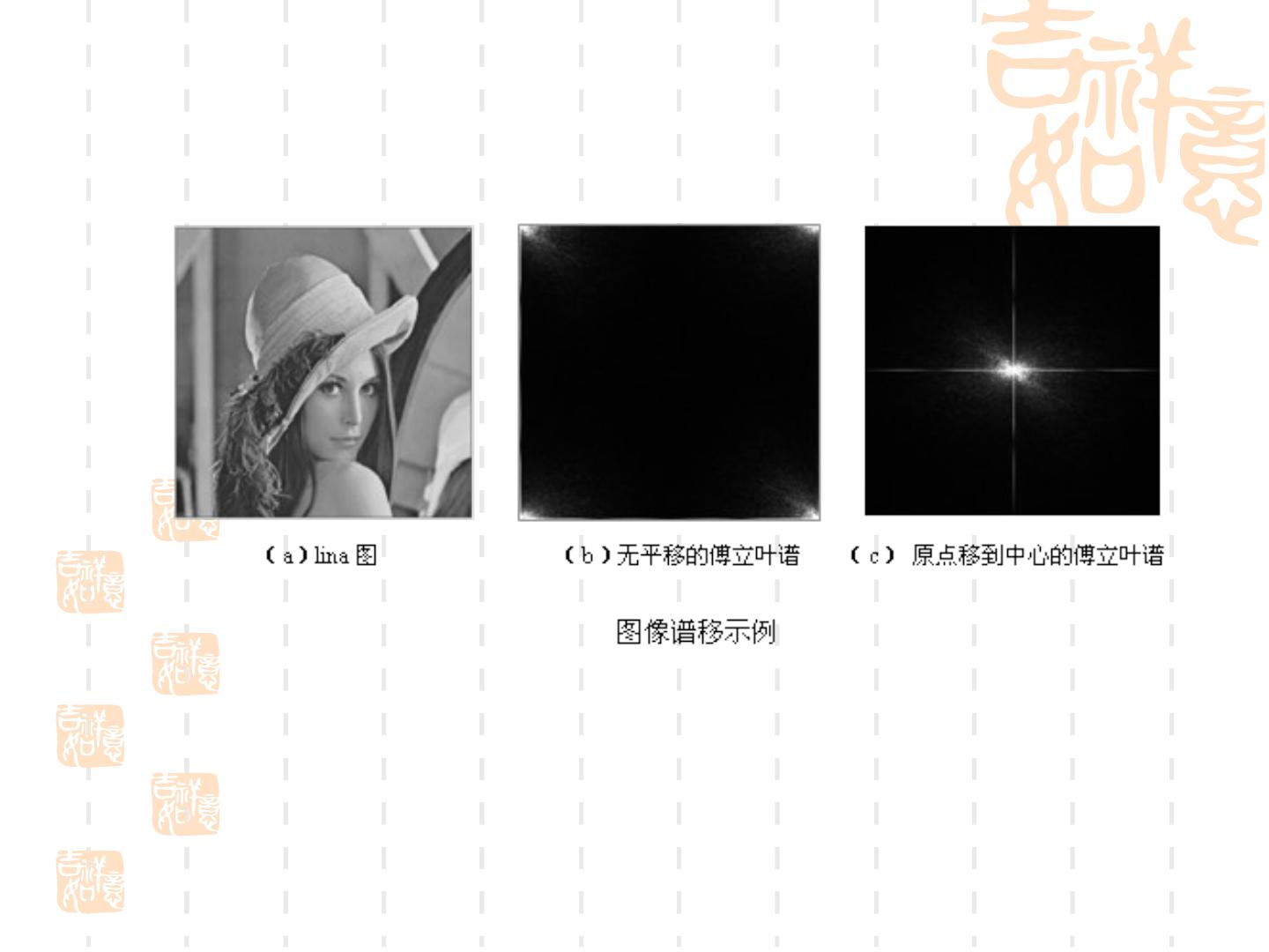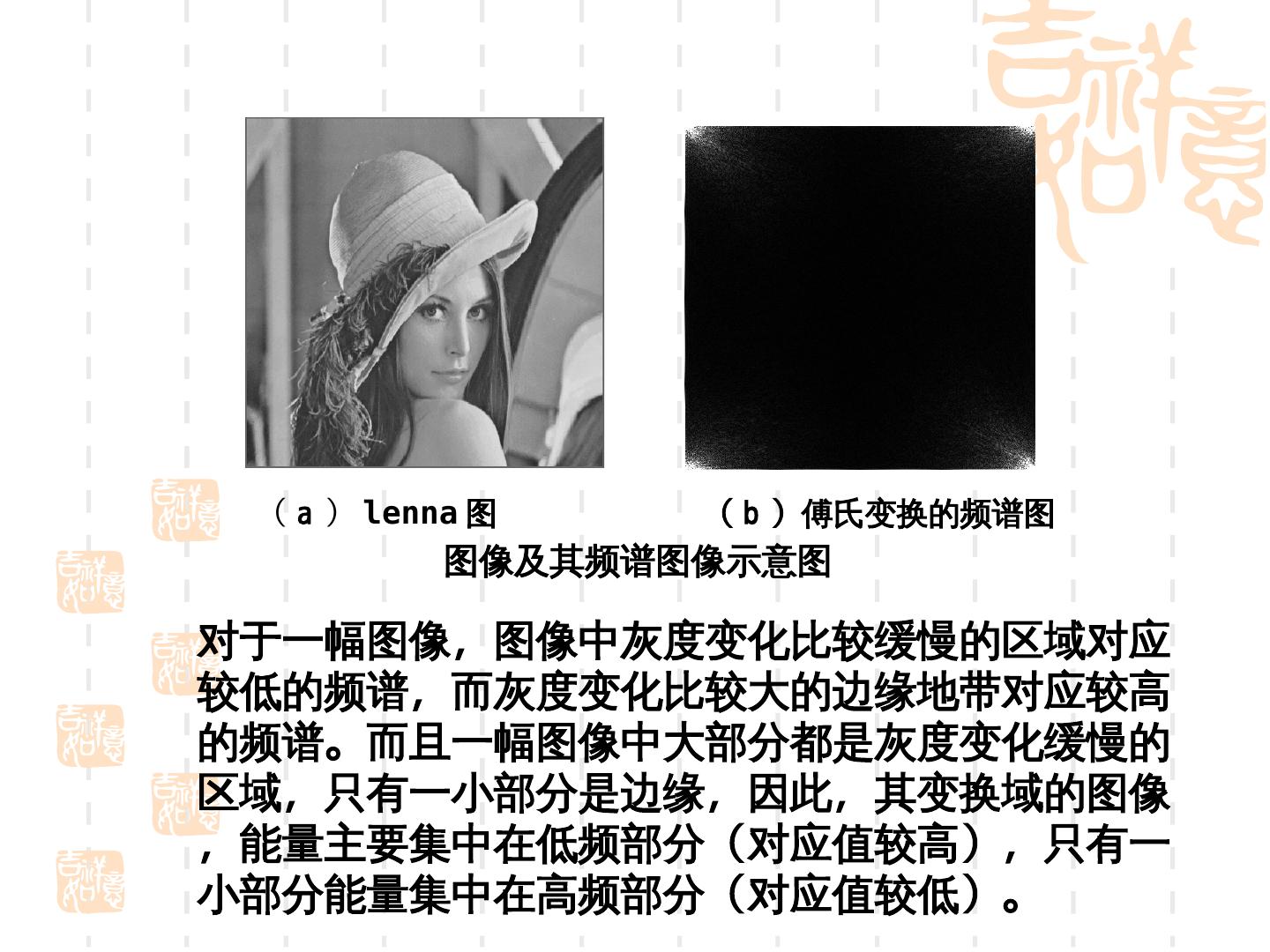 22 . ( a ) l)enna 图 ( b )傅氏变换的频谱图 图像及其频谱图像示意图 对于一幅图像,图像中灰度变化比较缓慢的区域对应 较低的频谱,而灰度变化比较大的边缘地带对应较高 的频谱。而且一幅图像中大部分都是灰度变化缓慢的 区域,只有一小部分是边缘,因此,其变换域的图像 ,能量主要集中在低频部分(对应值较高),只有一 小部分能量集中在高频部分(对应值较低)。