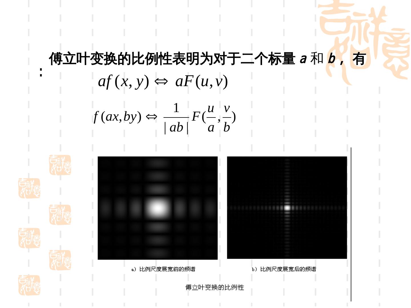 25 . 傅立叶变换的比例性表明为对于二个标量 a 和 b ,有 :电荷耦合器件 af ( x, y ) aF (u , v) 1 u v f (ax, by ) F( , ) | ab | a b