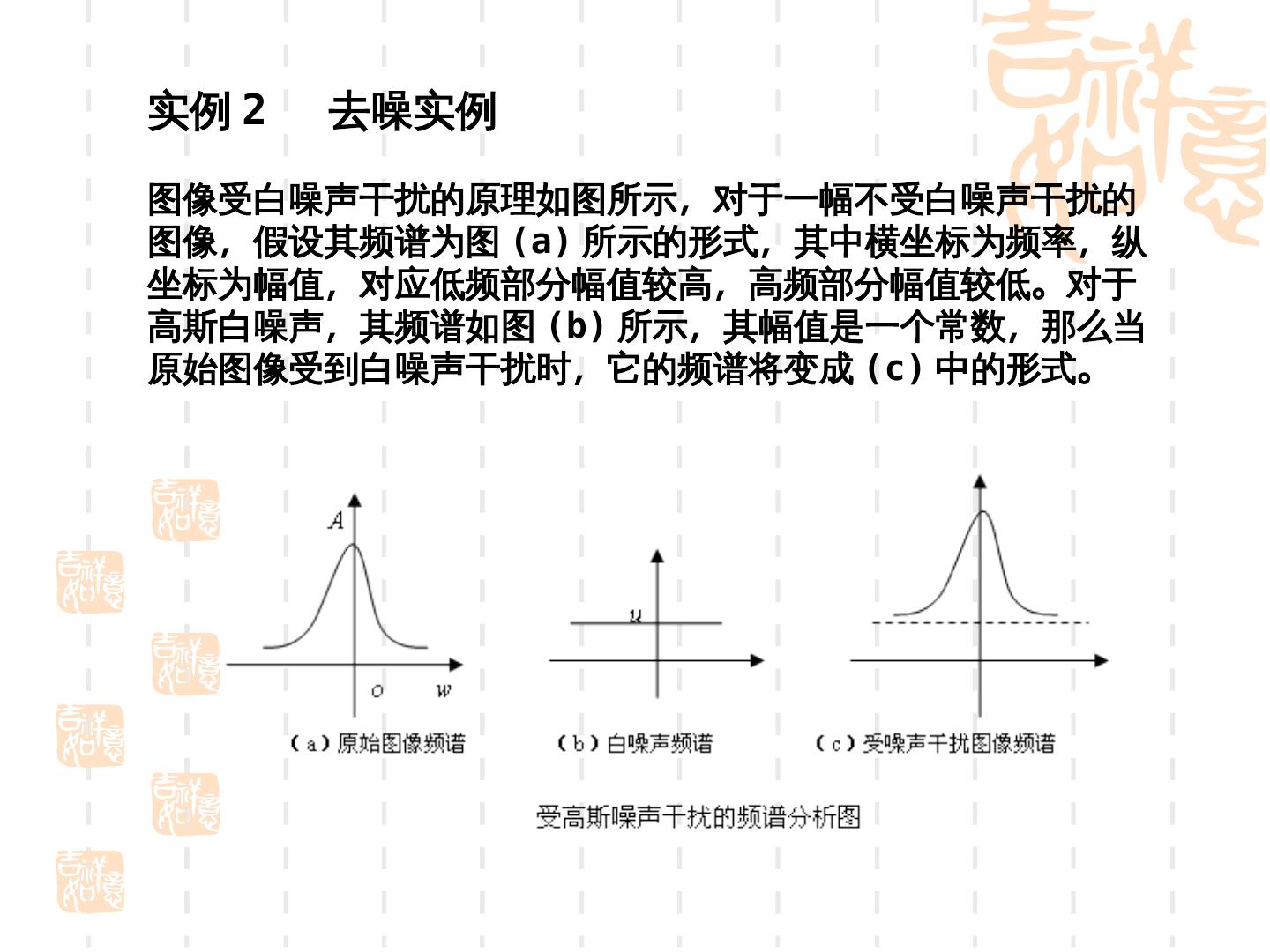 27 .实例 2 去噪实例 图像受白噪声干扰的原理如图所示,对于一幅不受白噪声干扰的 图像,假设其频谱为图 (psychophysical)a) 所示的形式,其中横坐标为频率,纵 坐标为幅值,对应低频部分幅值较高,高频部分幅值较低。对于 高斯白噪声,其频谱如图 (psychophysical)b)) 所示,其幅值是一个常数,那么当 原始图像受到白噪声干扰时,它的频谱将变成 (psychophysical)c) 中的形式。