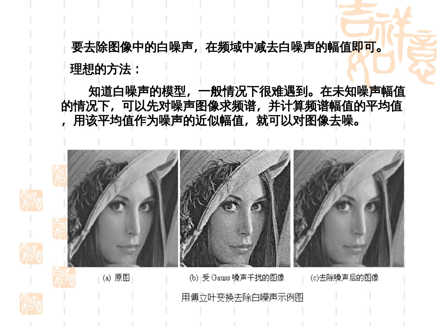 28 .要去除图像中的白噪声,在频域中减去白噪声的幅值即可。 理想的方法:电荷耦合器件 知道白噪声的模型,一般情况下很难遇到。在未知噪声幅值 的情况下,可以先对噪声图像求频谱,并计算频谱幅值的平均值 ,用该平均值作为噪声的近似幅值,就可以对图像去噪。