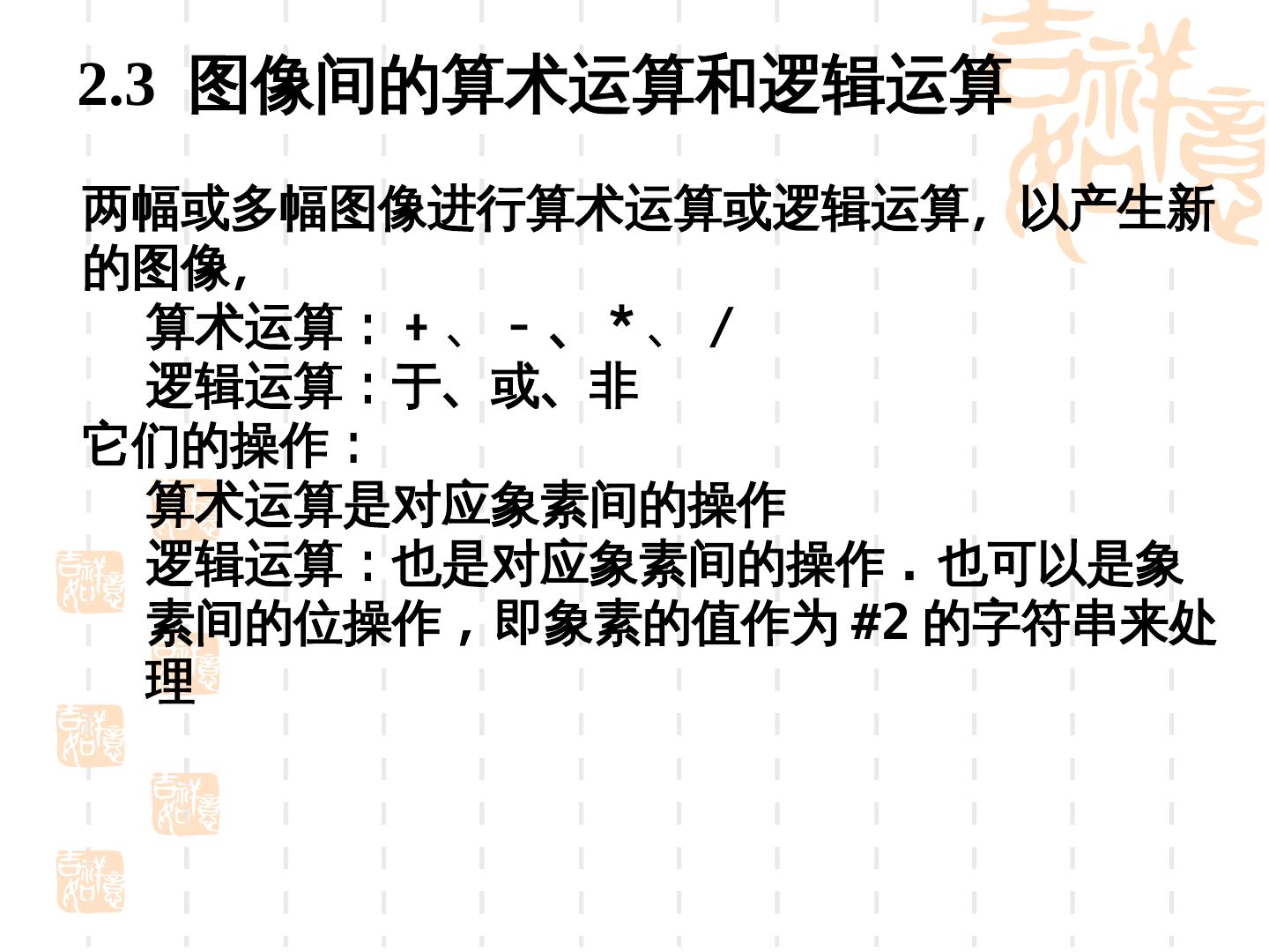 2 .图像处理 • 目的 突出感兴趣特征,服务于机器视觉 图像增强 •可能的处理 : 去除噪音、边缘增强、提高对比度、增加亮度、改 善颜色效果、改善细微层次等 —— 通常与改善视觉效果相一致