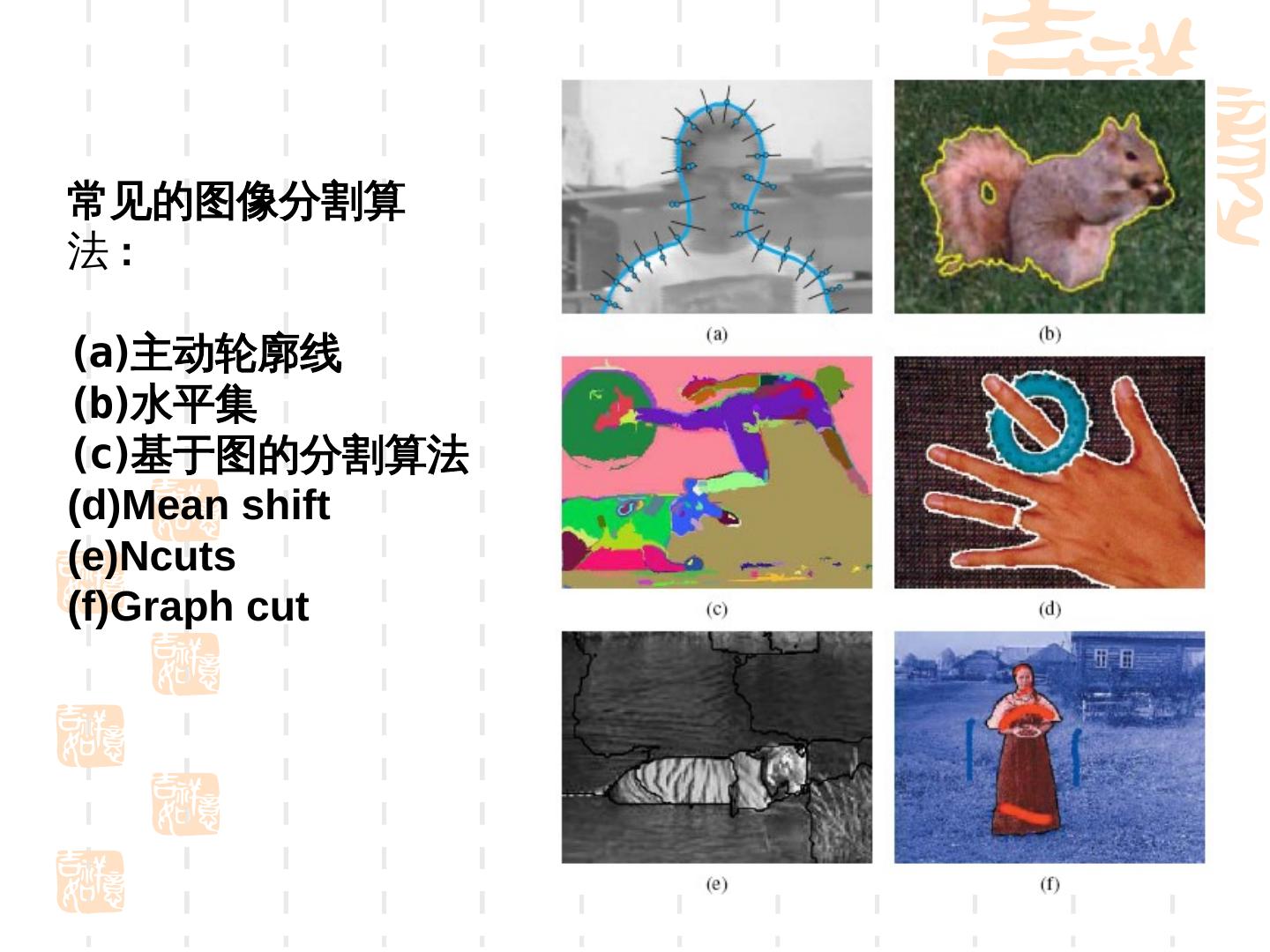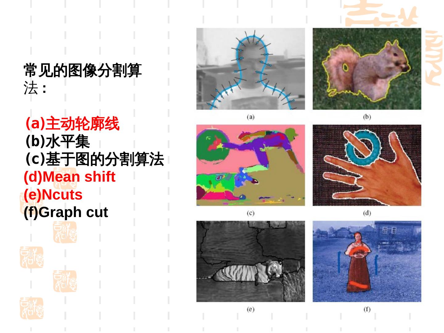 3 .常见的图像分割算 法: (a)主动轮廓线 (b)水平集 (c)基于图的分割算法 (d)Mean shift (e)Ncuts (f)Graph cut