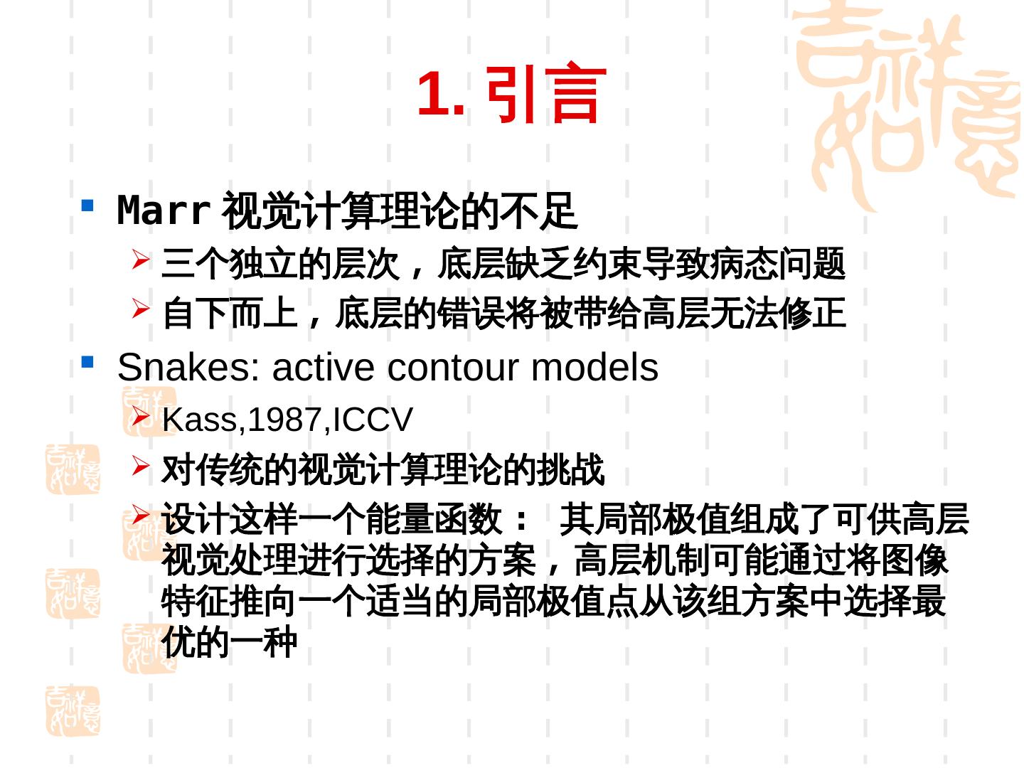 5 . 1. 引言 Marr 视觉计算理论的不足 三个独立的层次 , 底层缺乏约束导致病态问题 自下而上 , 底层的错误将被带给高层无法修正 Snakes: active contour models Kass,1987,ICCV 对传统的视觉计算理论的挑战 设计这样一个能量函数 : 其局部极值组成了可供高层 视觉处理进行选择的方案 , 高层机制可能通过将图像 特征推向一个适当的局部极值点从该组方案中选择最 优的一种