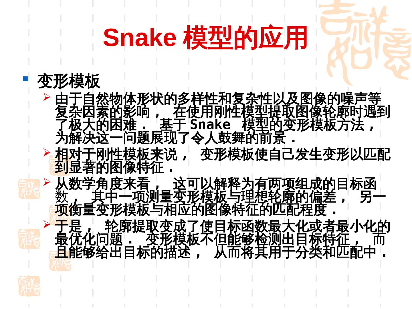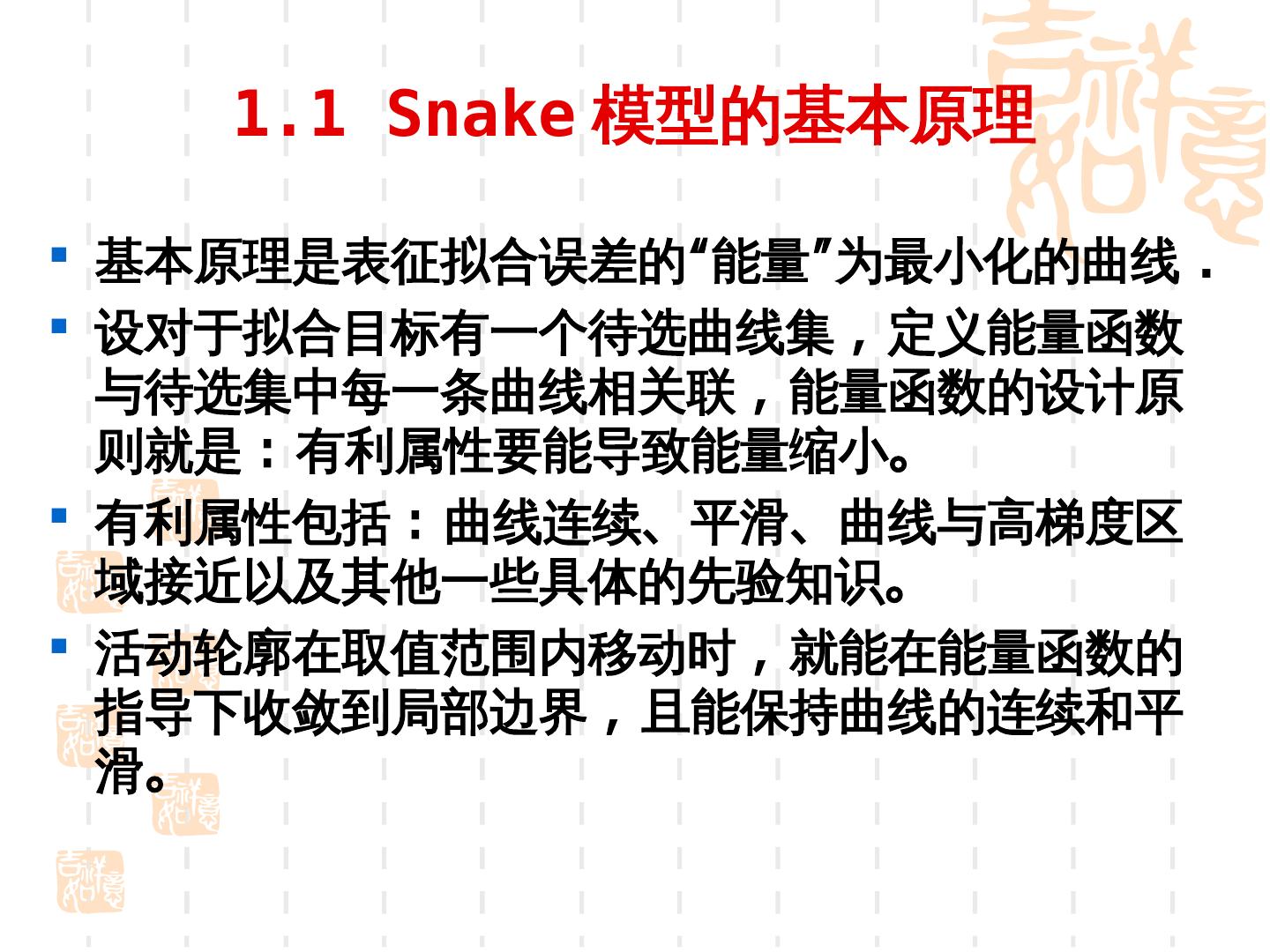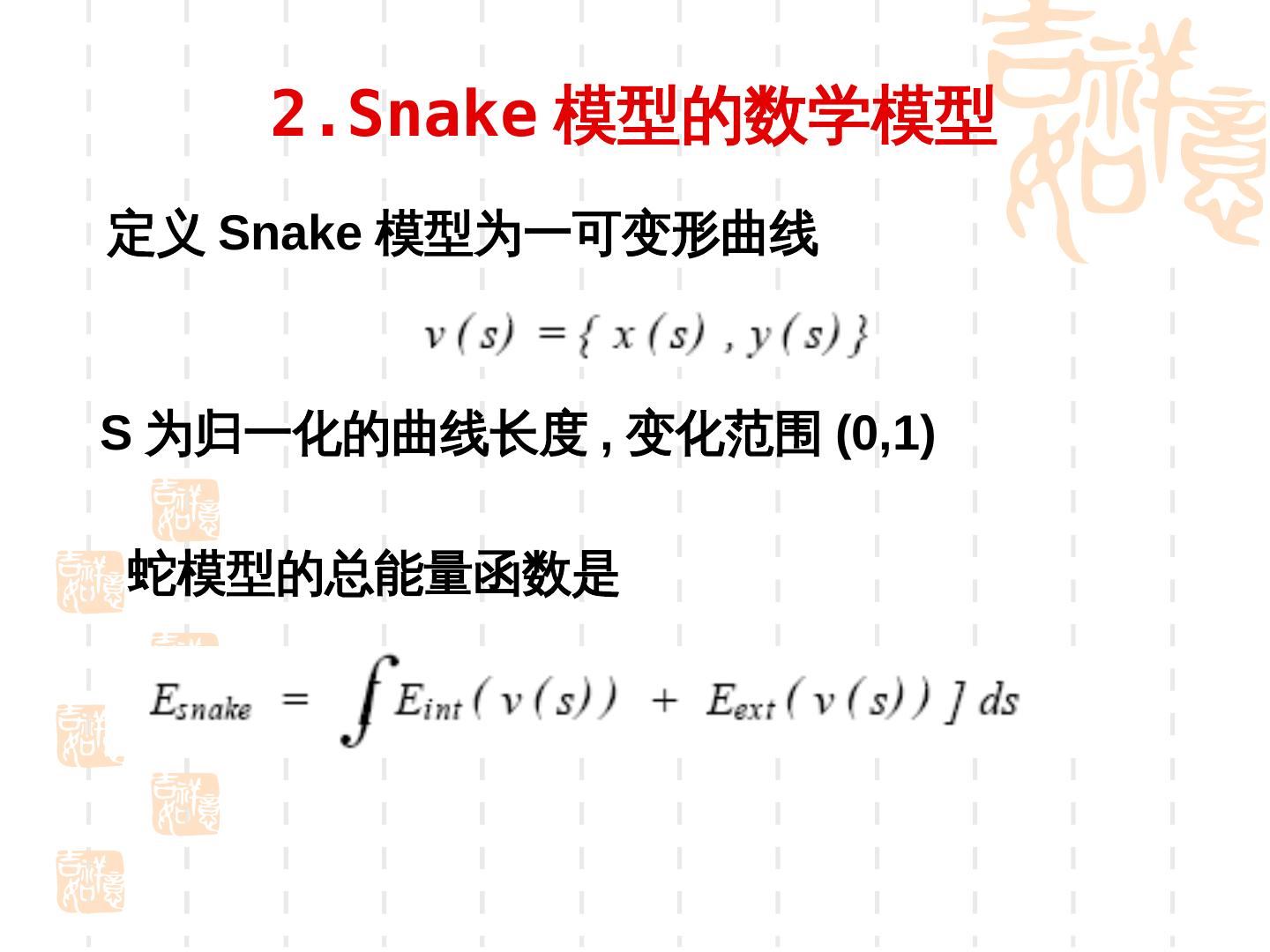 10 . 2.Snake 模型的数学模型 定义 Snake 模型为一可变形曲线 S 为归一化的曲线长度 , 变化范围 (0,1) 蛇模型的总能量函数是