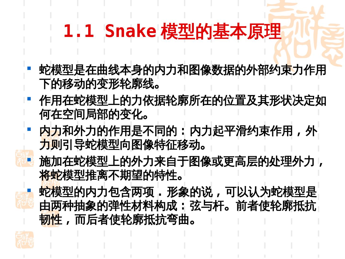 7 . 1.1 Snake 模型的基本原理 蛇模型是在曲线本身的内力和图像数据的外部约束力作用 下的移动的变形轮廓线。 作用在蛇模型上的力依据轮廓所在的位置及其形状决定如 何在空间局部的变化。 内力和外力的作用是不同的 : 内力起平滑约束作用 , 外 力则引导蛇模型向图像特征移动。 施加在蛇模型上的外力来自于图像或更高层的处理外力 , 将蛇模型推离不期望的特性。 蛇模型的内力包含两项 . 形象的说 , 可以认为蛇模型是 由两种抽象的弹性材料构成 : 弦与杆。前者使轮廓抵抗 韧性 , 而后者使轮廓抵抗弯曲。