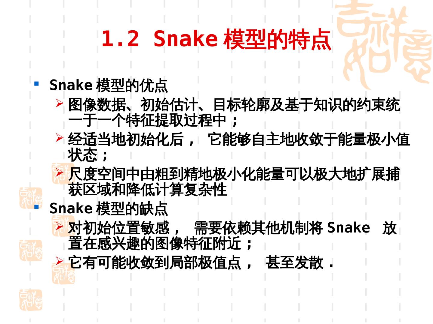 9 . 1.2 Snake 模型的特点 Snake 模型的优点 图像数据、初始估计、目标轮廓及基于知识的约束统 一于一个特征提取过程中 ; 经适当地初始化后 , 它能够自主地收敛于能量极小值 状态 ; 尺度空间中由粗到精地极小化能量可以极大地扩展捕 获区域和降低计算复杂性 Snake 模型的缺点 对初始位置敏感 , 需要依赖其他机制将 Snake 放 置在感兴趣的图像特征附近 ; 它有可能收敛到局部极值点 , 甚至发散 .
