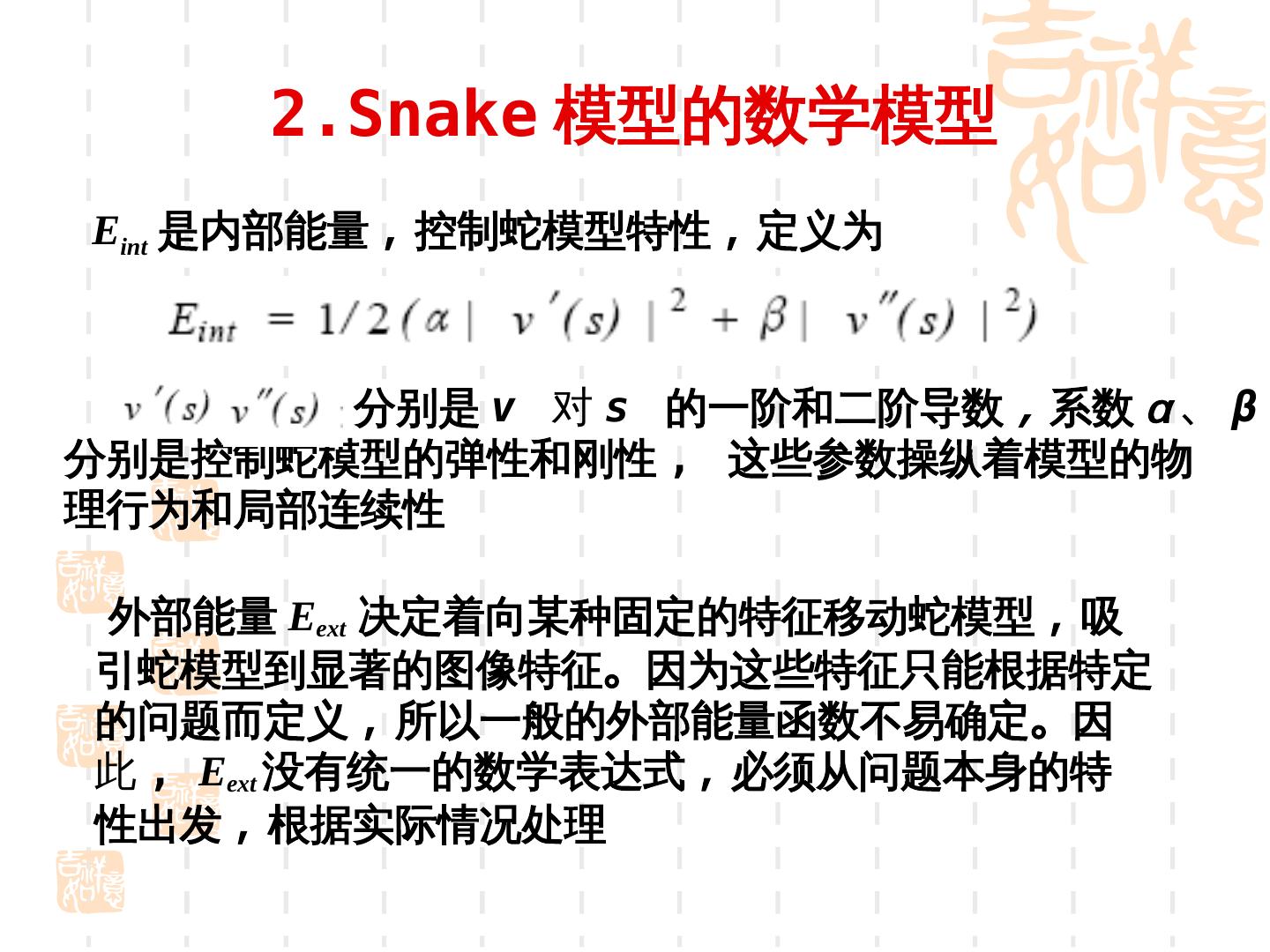 11 . 2.Snake 模型的数学模型 Eint 是内部能量 , 控制蛇模型特性 , 定义为 分别是 v 对 s 的一阶和二阶导数 , 系数 α 、 β 分别是控制蛇模型的弹性和刚性 , 这些参数操纵着模型的物 理行为和局部连续性 外部能量 Eext 决定着向某种固定的特征移动蛇模型 , 吸 引蛇模型到显著的图像特征。因为这些特征只能根据特定 的问题而定义 , 所以一般的外部能量函数不易确定。因 此 , Eext 没有统一的数学表达式 , 必须从问题本身的特 性出发 , 根据实际情况处理