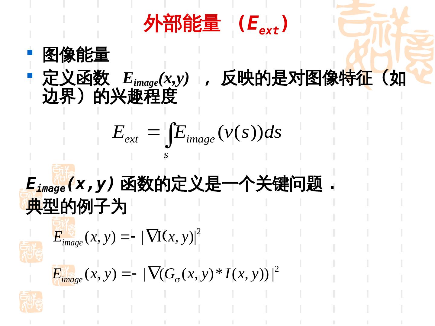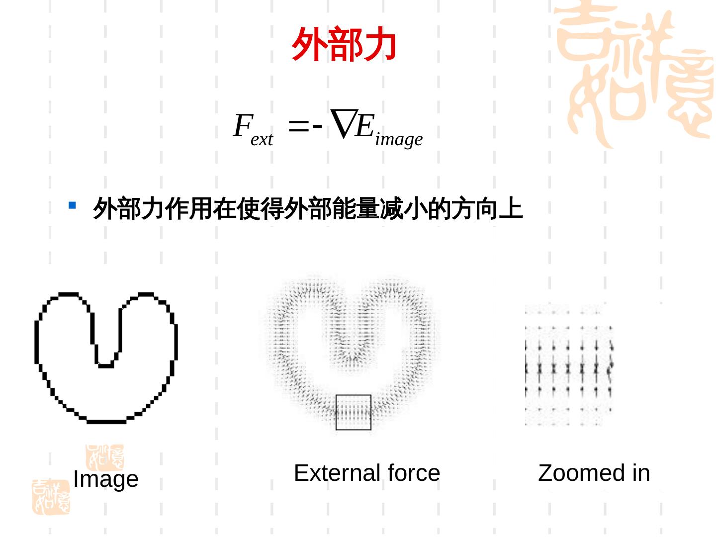 16 . 外部力 Fext Eimage 外部力作用在使得外部能量减小的方向上 Image External force Zoomed in