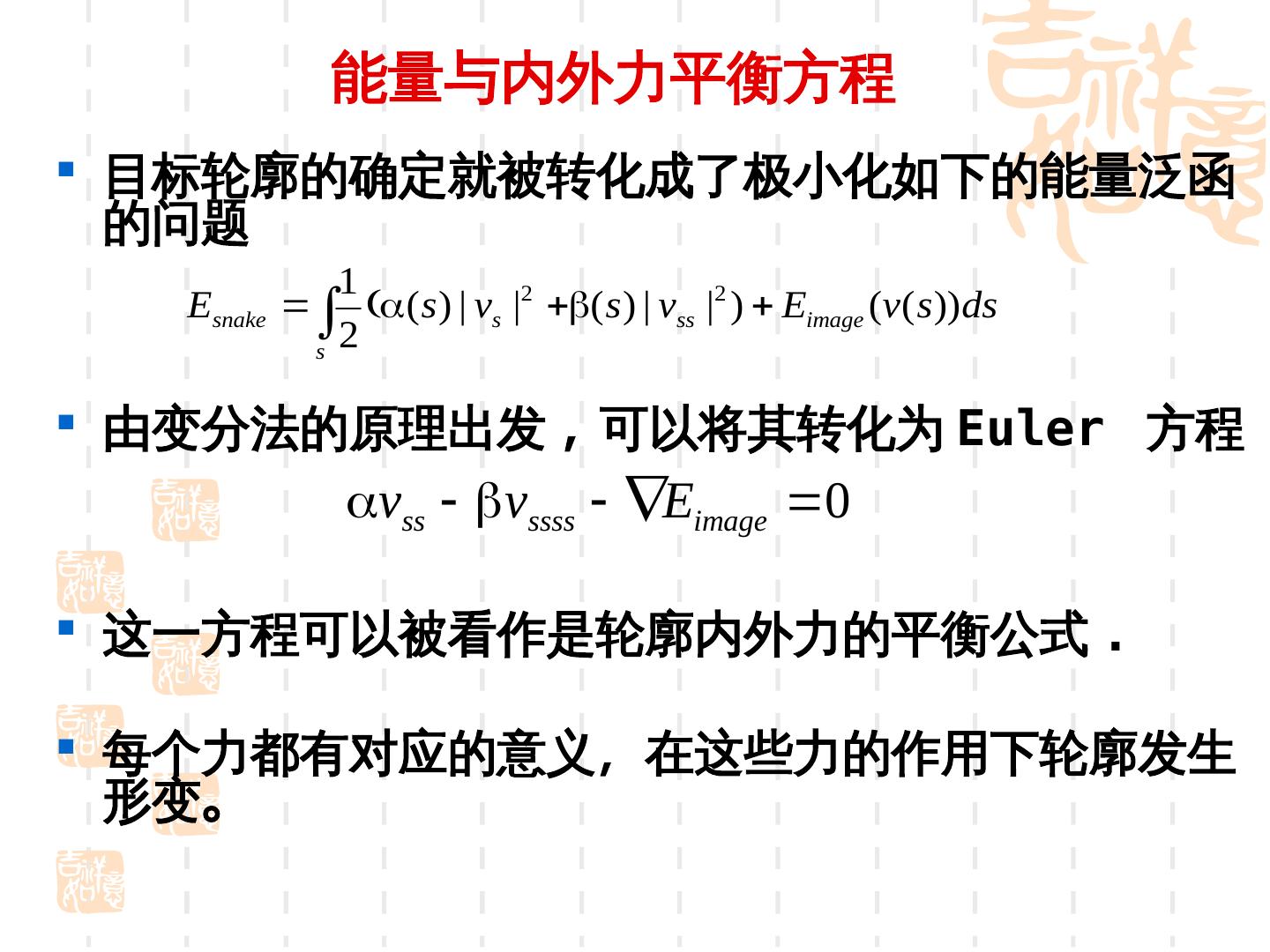 13 . 能量与内外力平衡方程 目标轮廓的确定就被转化成了极小化如下的能量泛函 的问题 1 Esnake ( s ) | vs |2 ( s ) | vss |2 ) Eimage (v( s ))ds s 2 由变分法的原理出发 , 可以将其转化为 Euler 方程 vss vssss Eimage 0 这一方程可以被看作是轮廓内外力的平衡公式 . 每个力都有对应的意义,反映的是对图像特征(如在这些力的作用下轮廓发生 形变。
