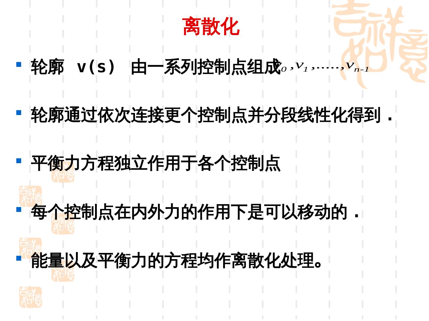 17 . 离散化 轮廓 v(s) 由一系列控制点组成v0 ,v1 ,.....,vn-1 轮廓通过依次连接更个控制点并分段线性化得到 . 平衡力方程独立作用于各个控制点 每个控制点在内外力的作用下是可以移动的 . 能量以及平衡力的方程均作离散化处理。