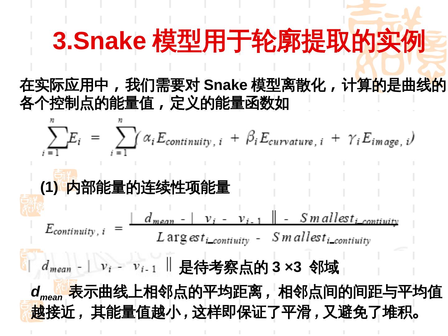 18 . 3.Snake 模型用于轮廓提取的实例 在实际应用中 , 我们需要对 Snake 模型离散化 , 计算的是曲线的 各个控制点的能量值 , 定义的能量函数如 (1) 内部能量的连续性项能量 是待考察点的 3 ×3 邻域 dmean 表示曲线上相邻点的平均距离 , 相邻点间的间距与平均值 越接近 , 其能量值越小 , 这样即保证了平滑 , 又避免了堆积。