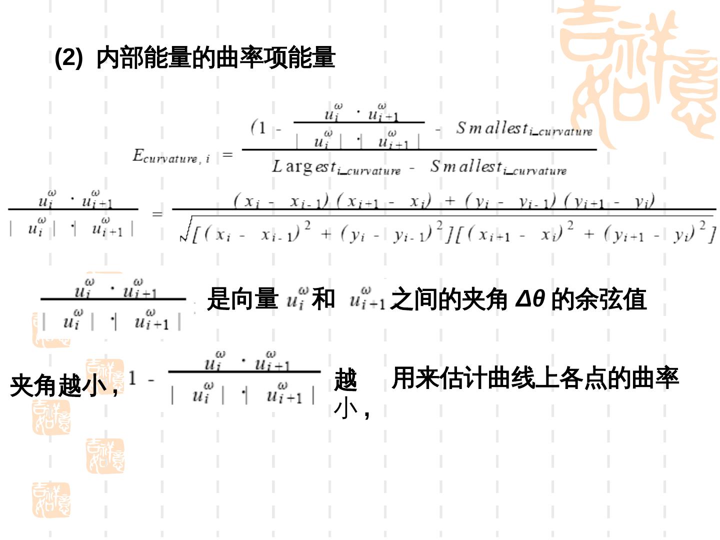 19 . (2) 内部能量的曲率项能量 是向量 和 之间的夹角 Δθ 的余弦值 夹角越小 , 越 用来估计曲线上各点的曲率 小,