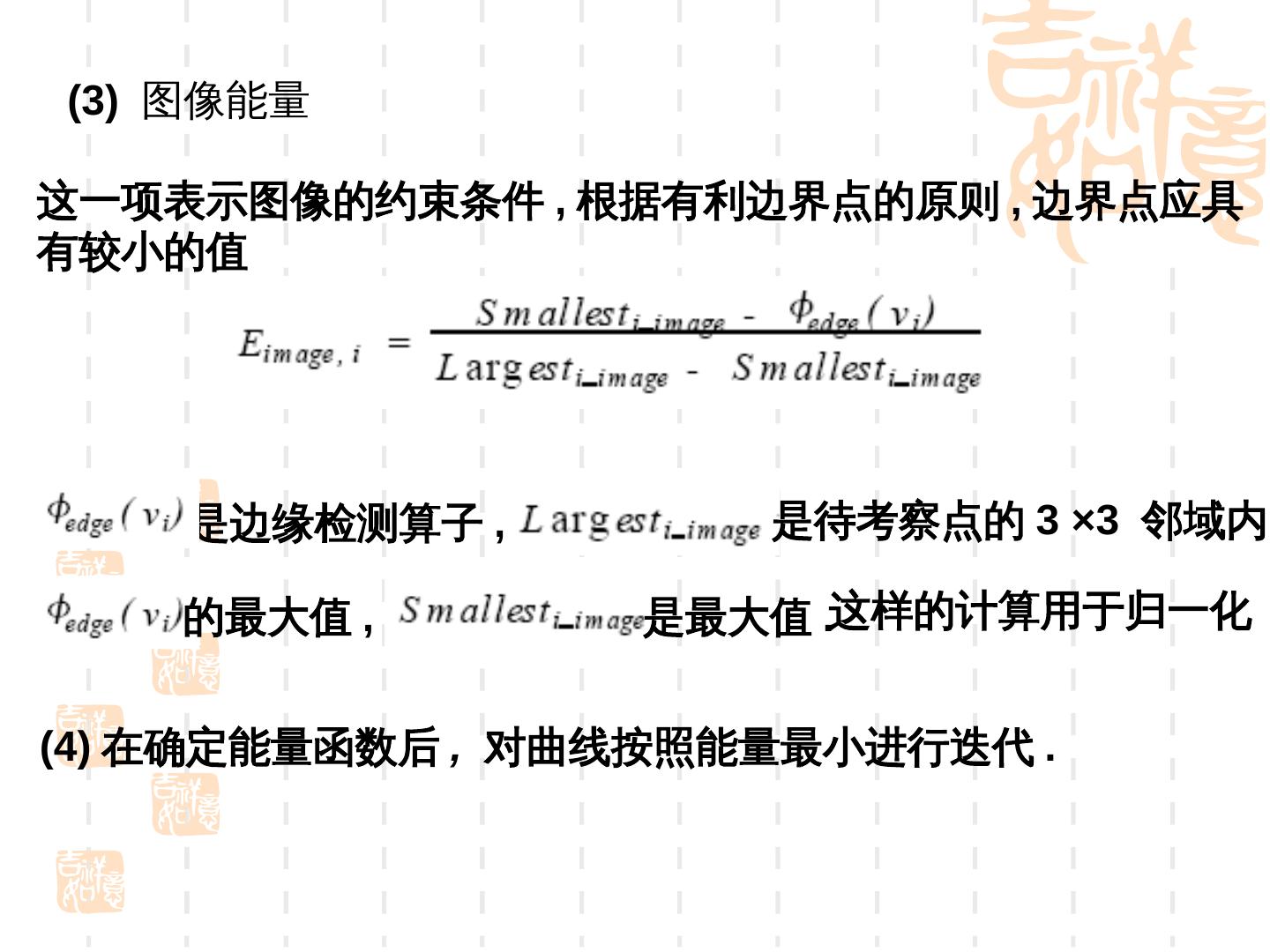 20 .(3) 图像能量 这一项表示图像的约束条件 , 根据有利边界点的原则 , 边界点应具 有较小的值 是边缘检测算子 , 是待考察点的 3 ×3 邻域内 的最大值 , 是最大值 .这样的计算用于归一化 (4) 在确定能量函数后 , 对曲线按照能量最小进行迭代 .