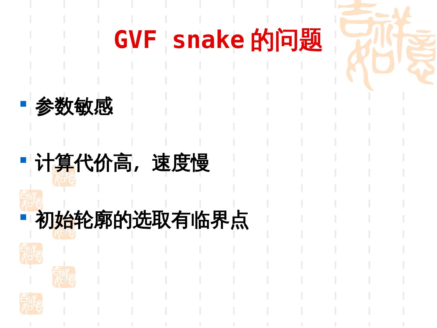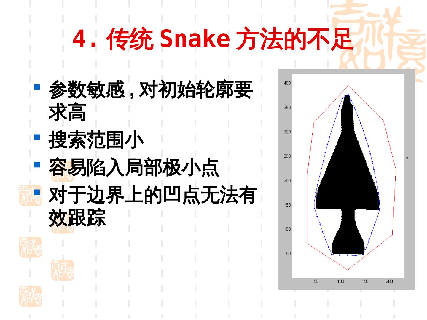 22 . 4. 传统 Snake 方法的不足 参数敏感 , 对初始轮廓要 求高 搜索范围小 容易陷入局部极小点 对于边界上的凹点无法有 效跟踪