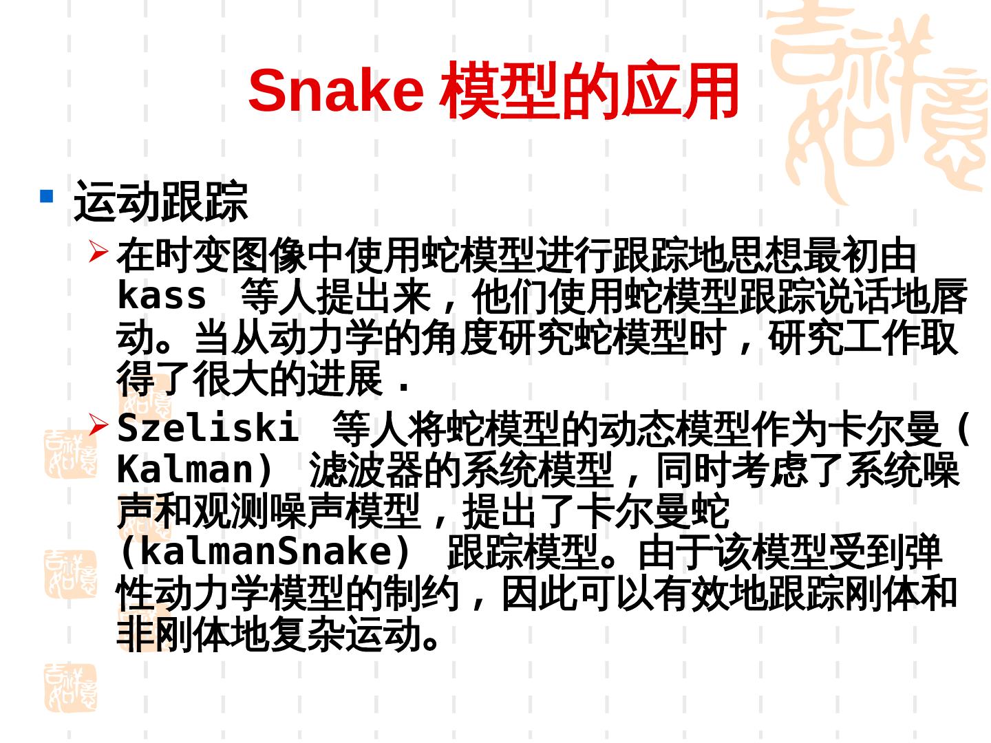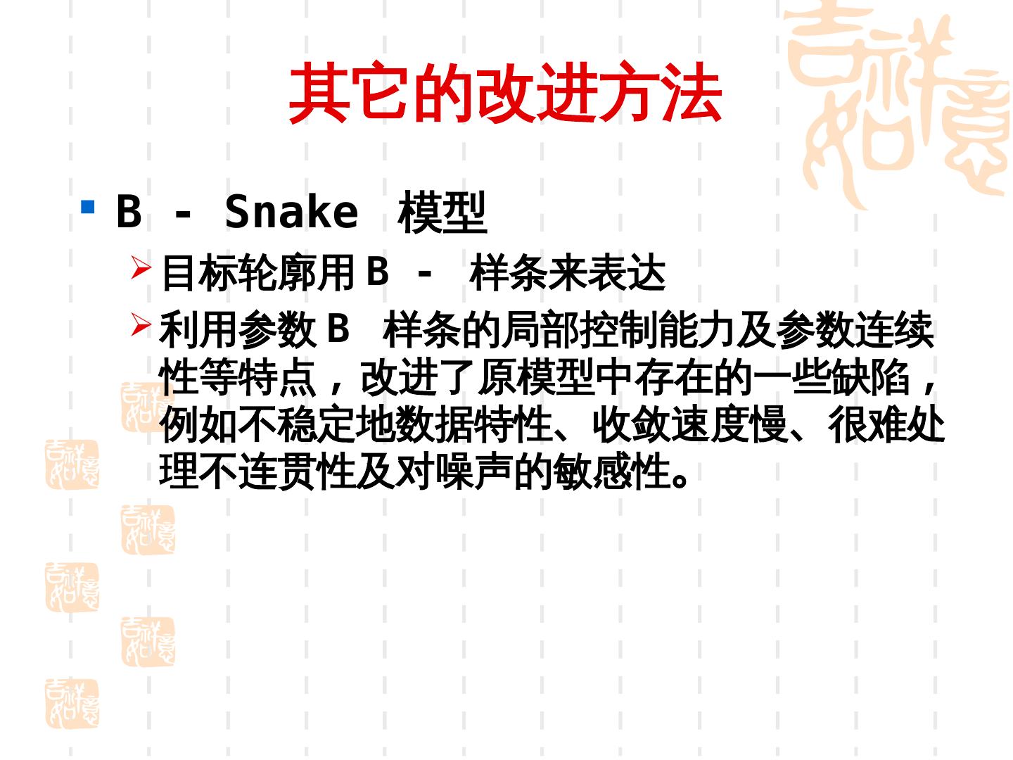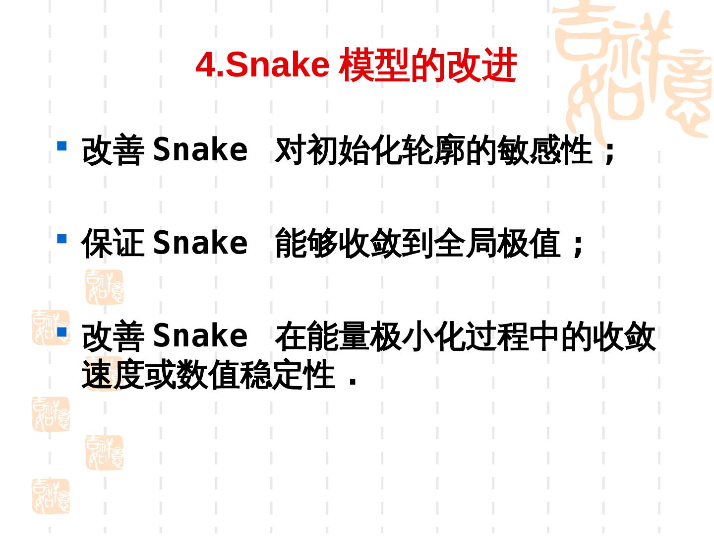23 . 4.Snake 模型的改进 改善 Snake 对初始化轮廓的敏感性 ; 保证 Snake 能够收敛到全局极值 ; 改善 Snake 在能量极小化过程中的收敛 速度或数值稳定性 .