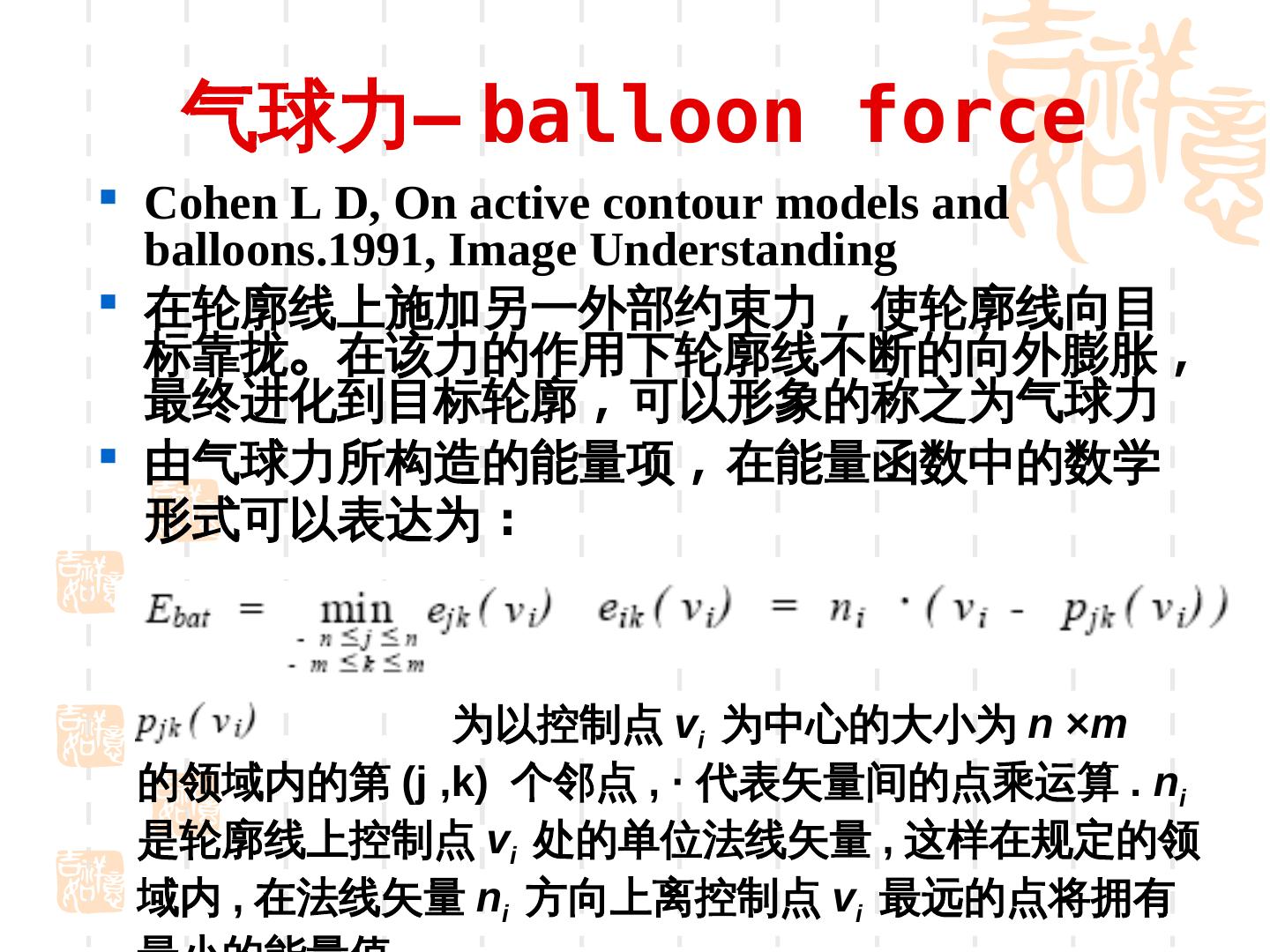 24 . 气球力— balloon force Cohen L D, On active contour models and balloons.1991, Image Understanding 在轮廓线上施加另一外部约束力 , 使轮廓线向目 标靠拢。在该力的作用下轮廓线不断的向外膨胀 , 最终进化到目标轮廓 , 可以形象的称之为气球力 由气球力所构造的能量项 , 在能量函数中的数学 形式可以表达为 : 为以控制点 vi 为中心的大小为 n ×m 的领域内的第 (j ,k) 个邻点 , · 代表矢量间的点乘运算 . ni 是轮廓线上控制点 vi 处的单位法线矢量 , 这样在规定的领 域内 , 在法线矢量 ni 方向上离控制点 vi 最远的点将拥有
