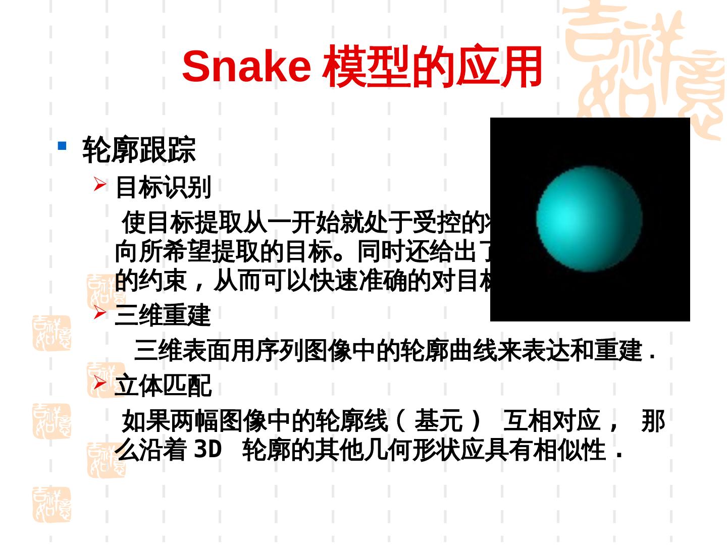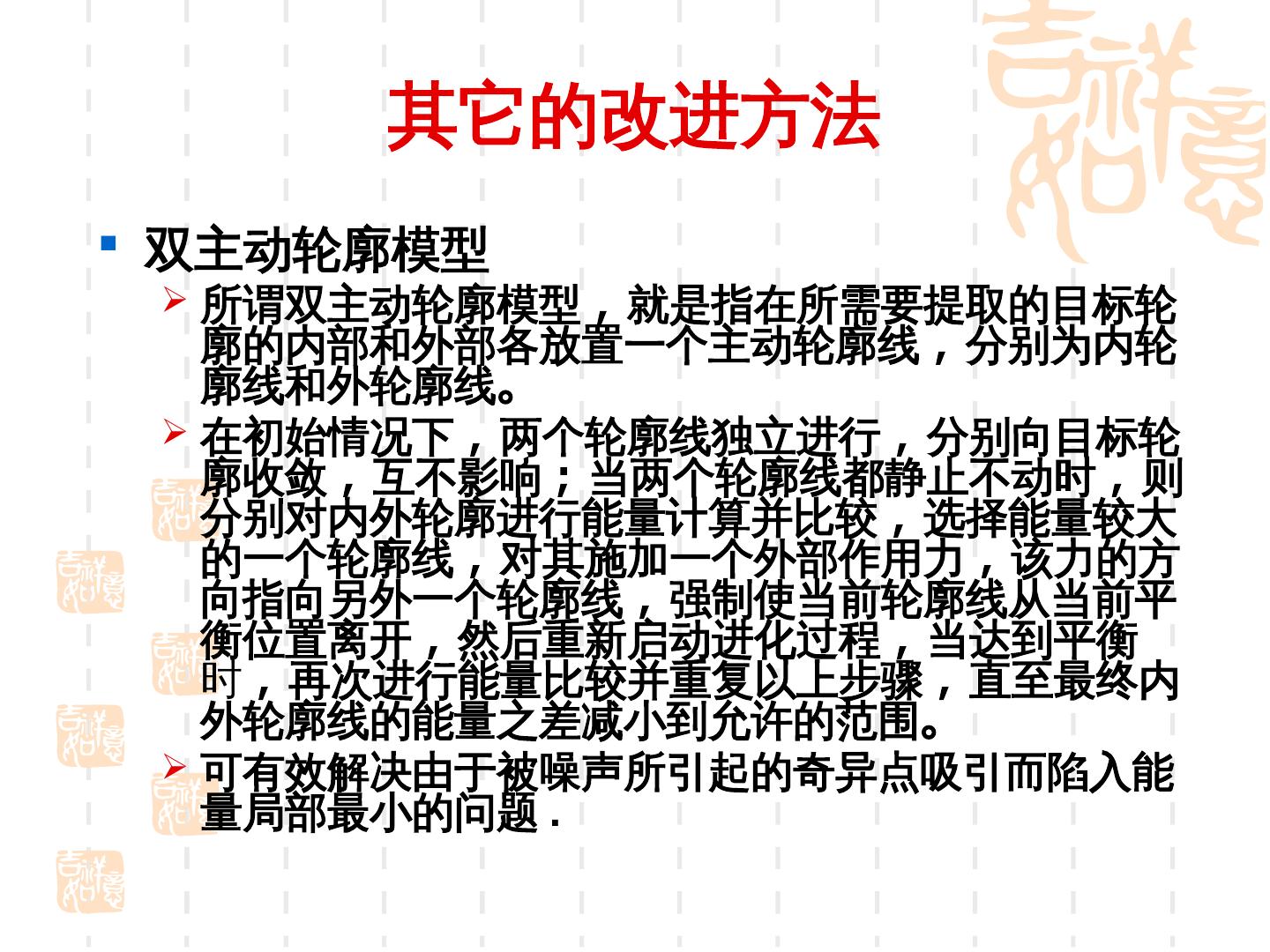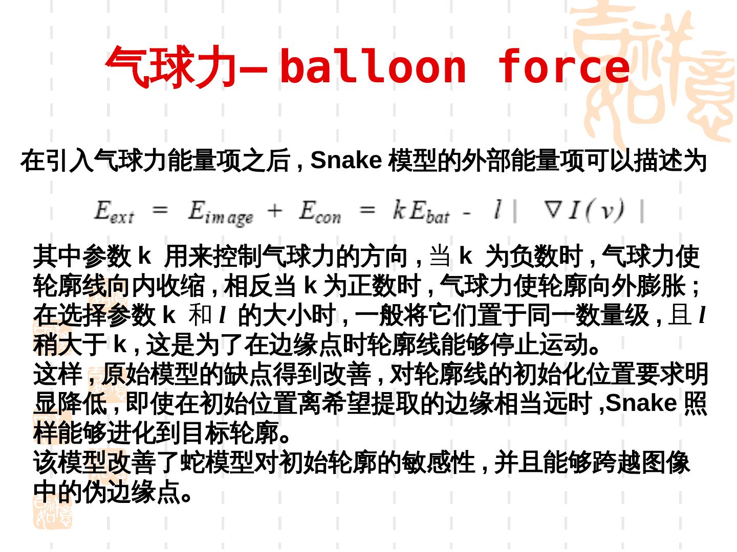 25 . 气球力— balloon force 在引入气球力能量项之后 , Snake 模型的外部能量项可以描述为 其中参数 k 用来控制气球力的方向 , 当 k 为负数时 , 气球力使 轮廓线向内收缩 , 相反当 k 为正数时 , 气球力使轮廓向外膨胀 ; 在选择参数 k 和 l 的大小时 , 一般将它们置于同一数量级 , 且 l 稍大于 k , 这是为了在边缘点时轮廓线能够停止运动。 这样 , 原始模型的缺点得到改善 , 对轮廓线的初始化位置要求明 显降低 , 即使在初始位置离希望提取的边缘相当远时 ,Snake 照 样能够进化到目标轮廓。 该模型改善了蛇模型对初始轮廓的敏感性 , 并且能够跨越图像 中的伪边缘点。