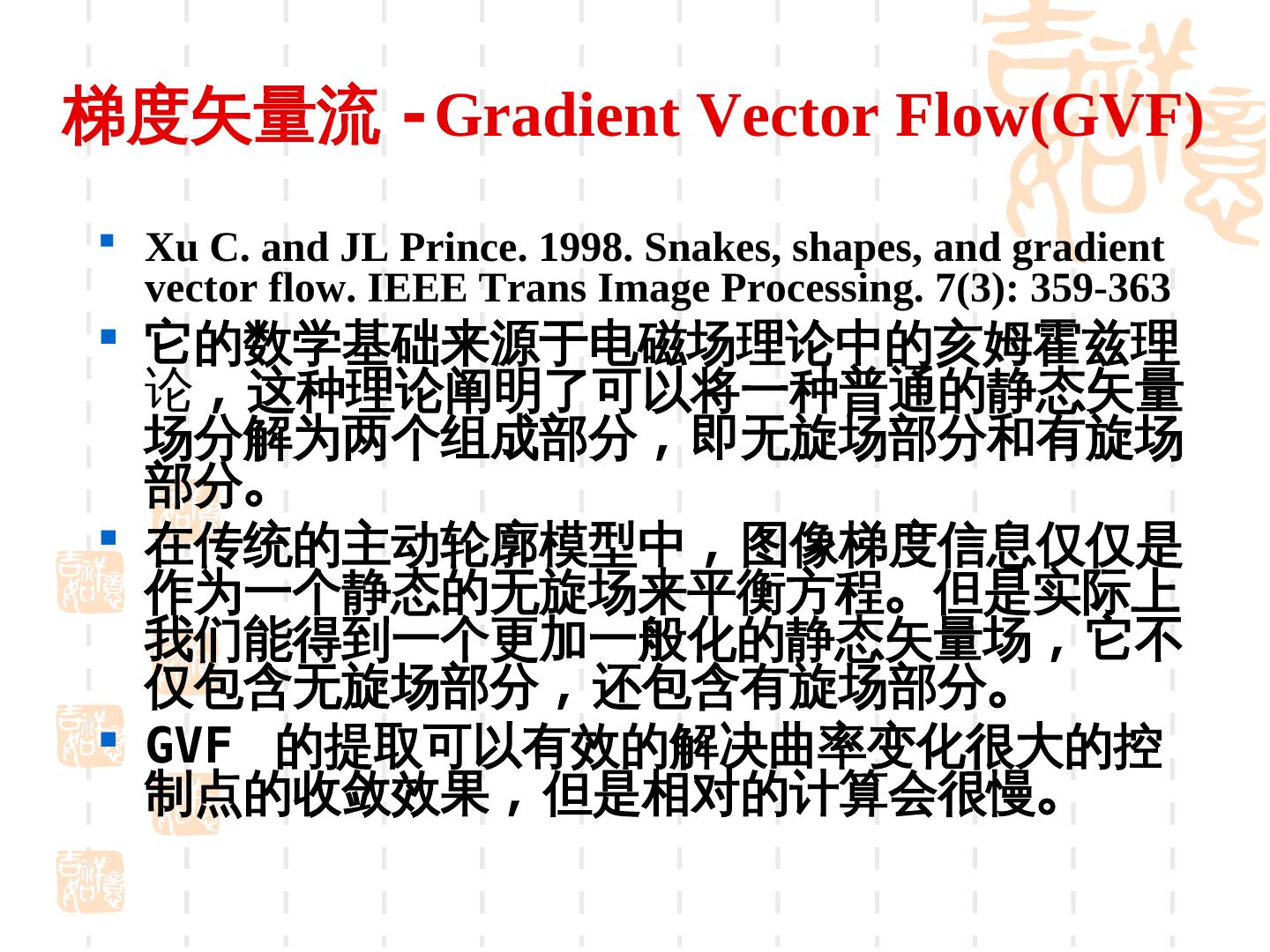 26 .梯度矢量流 -Gradient Vector Flow(GVF) Xu C. and JL Prince. 1998. Snakes, shapes, and gradient vector flow. IEEE Trans Image Processing. 7(3): 359-363 它的数学基础来源于电磁场理论中的亥姆霍兹理 论 , 这种理论阐明了可以将一种普通的静态矢量 场分解为两个组成部分 , 即无旋场部分和有旋场 部分。 在传统的主动轮廓模型中 , 图像梯度信息仅仅是 作为一个静态的无旋场来平衡方程。但是实际上 我们能得到一个更加一般化的静态矢量场 , 它不 仅包含无旋场部分 , 还包含有旋场部分。 GVF 的提取可以有效的解决曲率变化很大的控 制点的收敛效果 , 但是相对的计算会很慢。