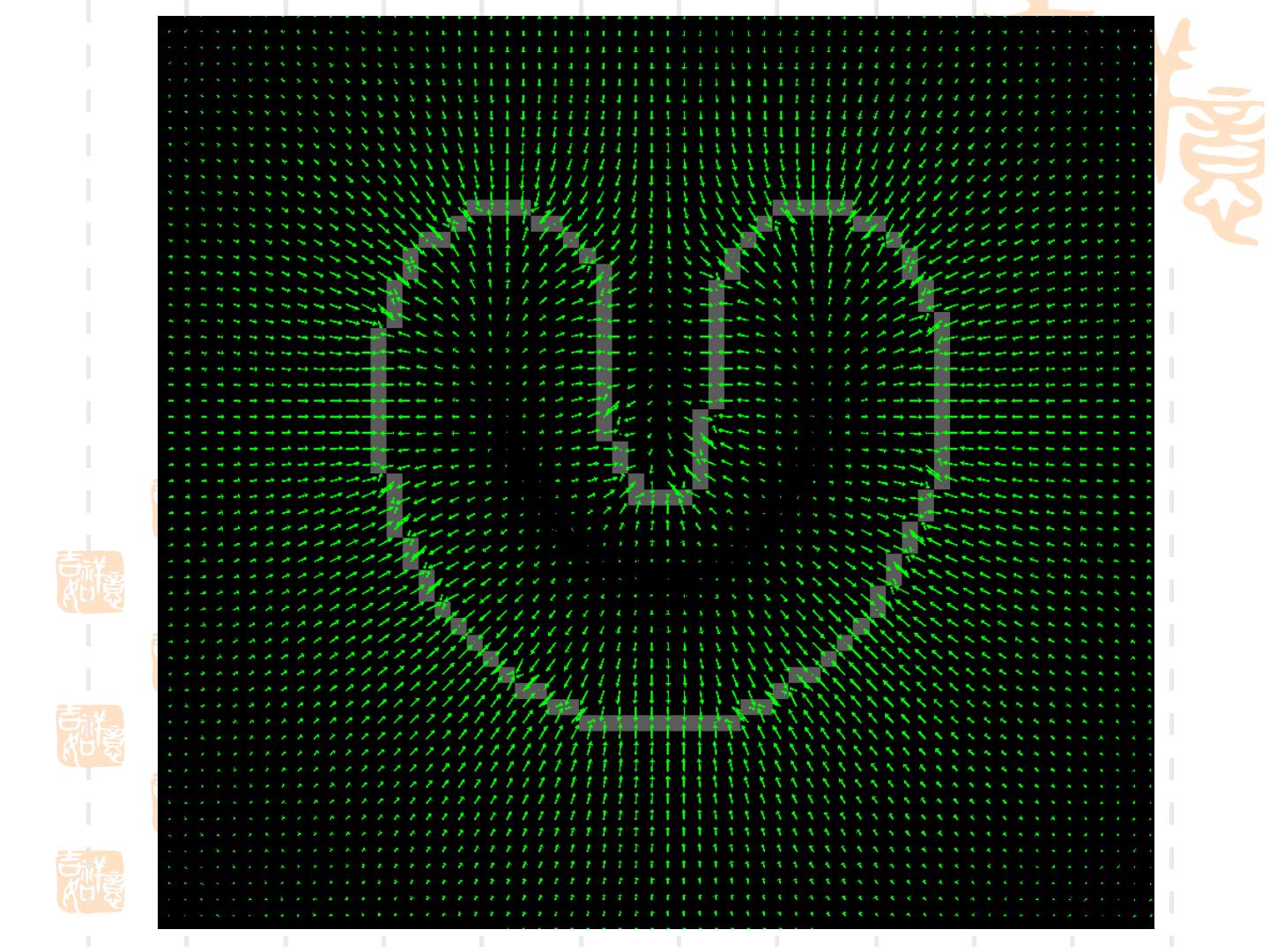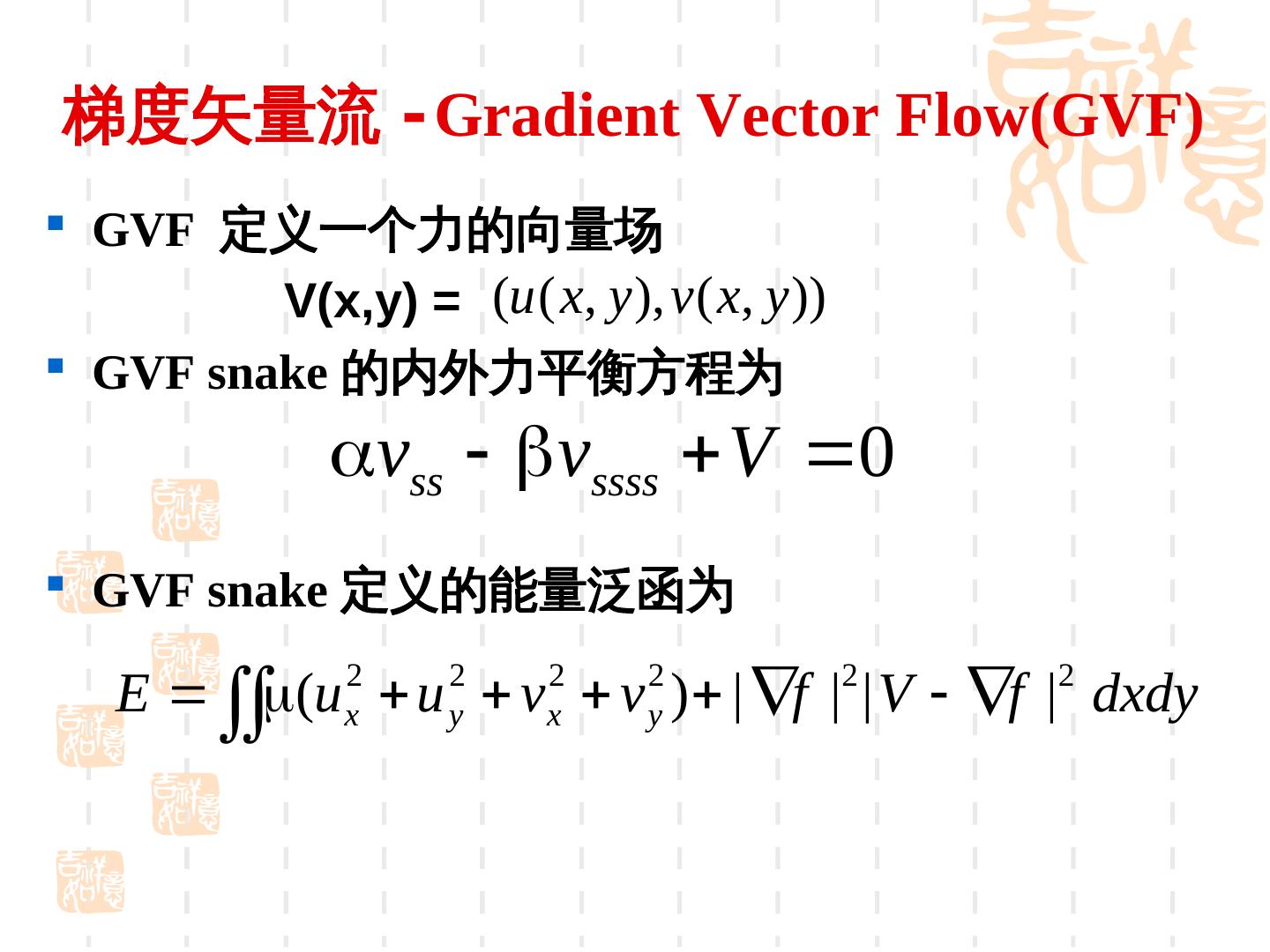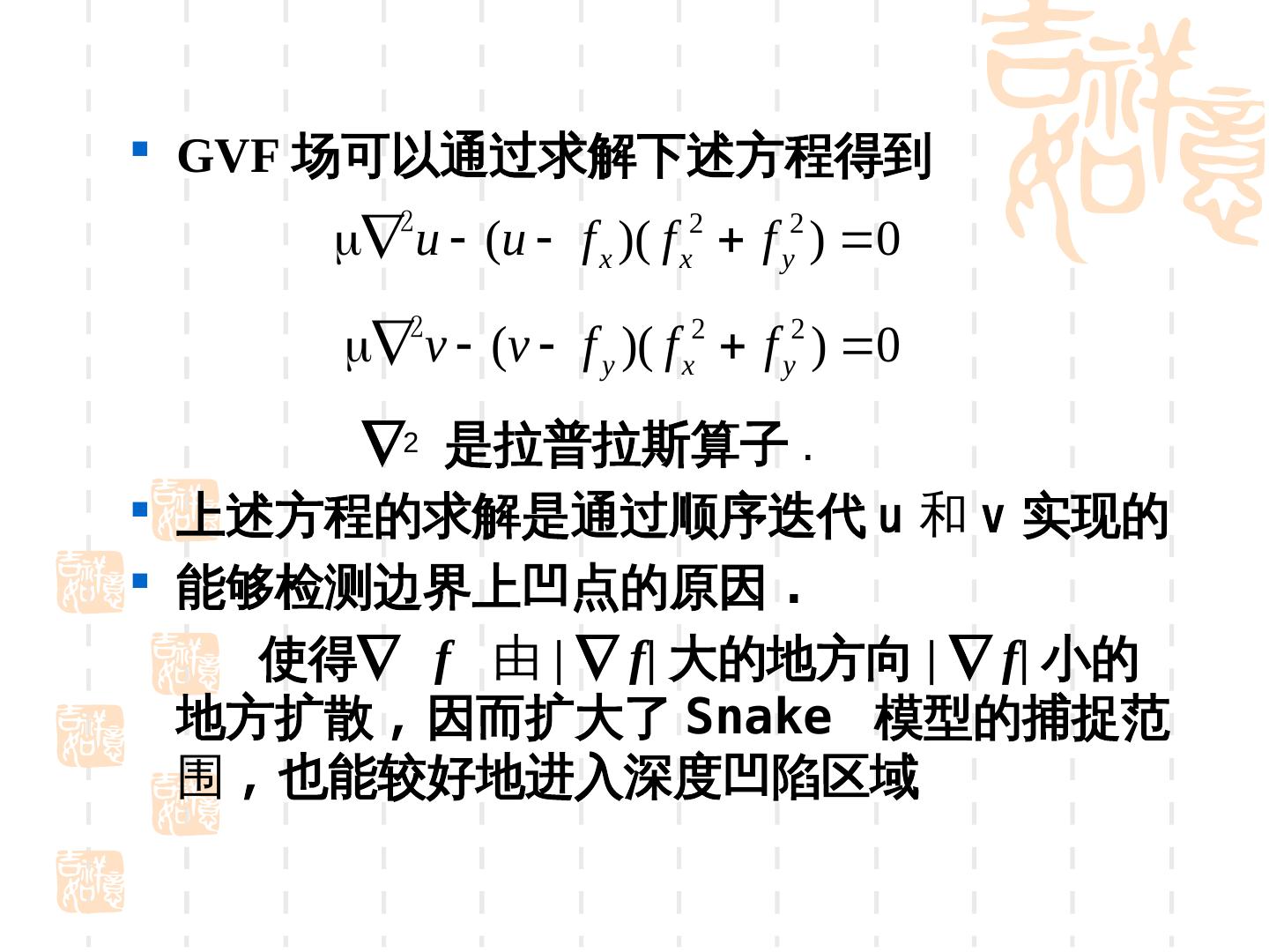28 . GVF 场可以通过求解下述方程得到 u (u f x )( f x2 f y2 ) 0 v (v f y )( f x2 f y2 ) 0 2 是拉普拉斯算子 . 上述方程的求解是通过顺序迭代 u 和 v 实现的 能够检测边界上凹点的原因 . 使得 f 由 | f| 大的地方向 | f| 小的 地方扩散 , 因而扩大了 Snake 模型的捕捉范 围 , 也能较好地进入深度凹陷区域