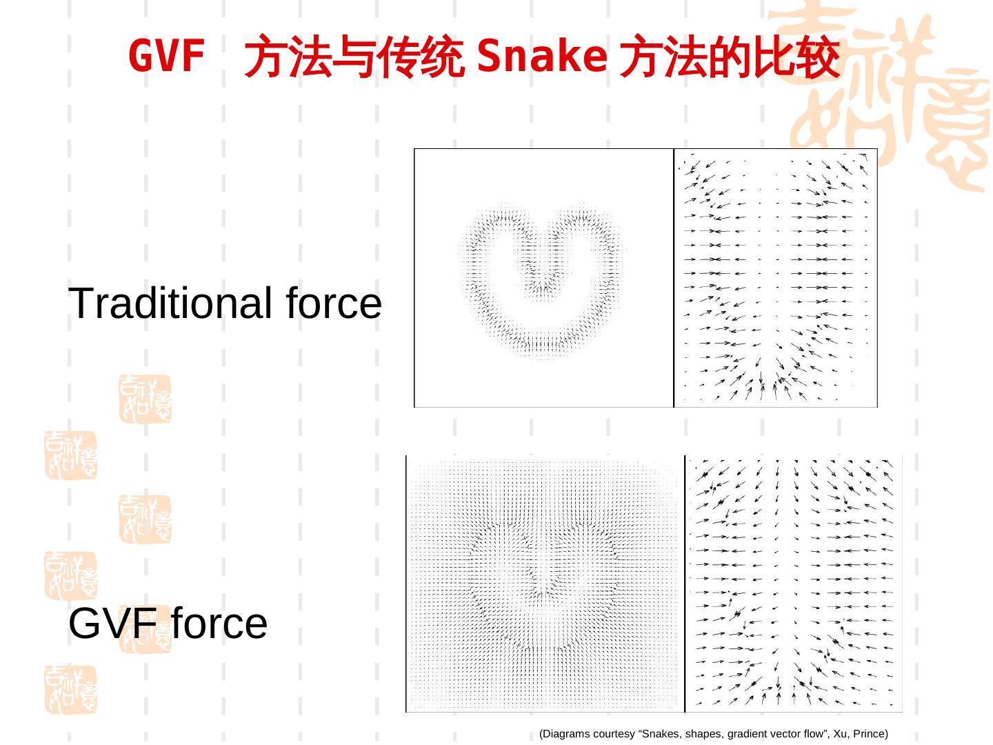 29 . GVF 方法与传统 Snake 方法的比较 Traditional force GVF force (Diagrams courtesy “Snakes, shapes, gradient vector flow”, Xu, Prince)