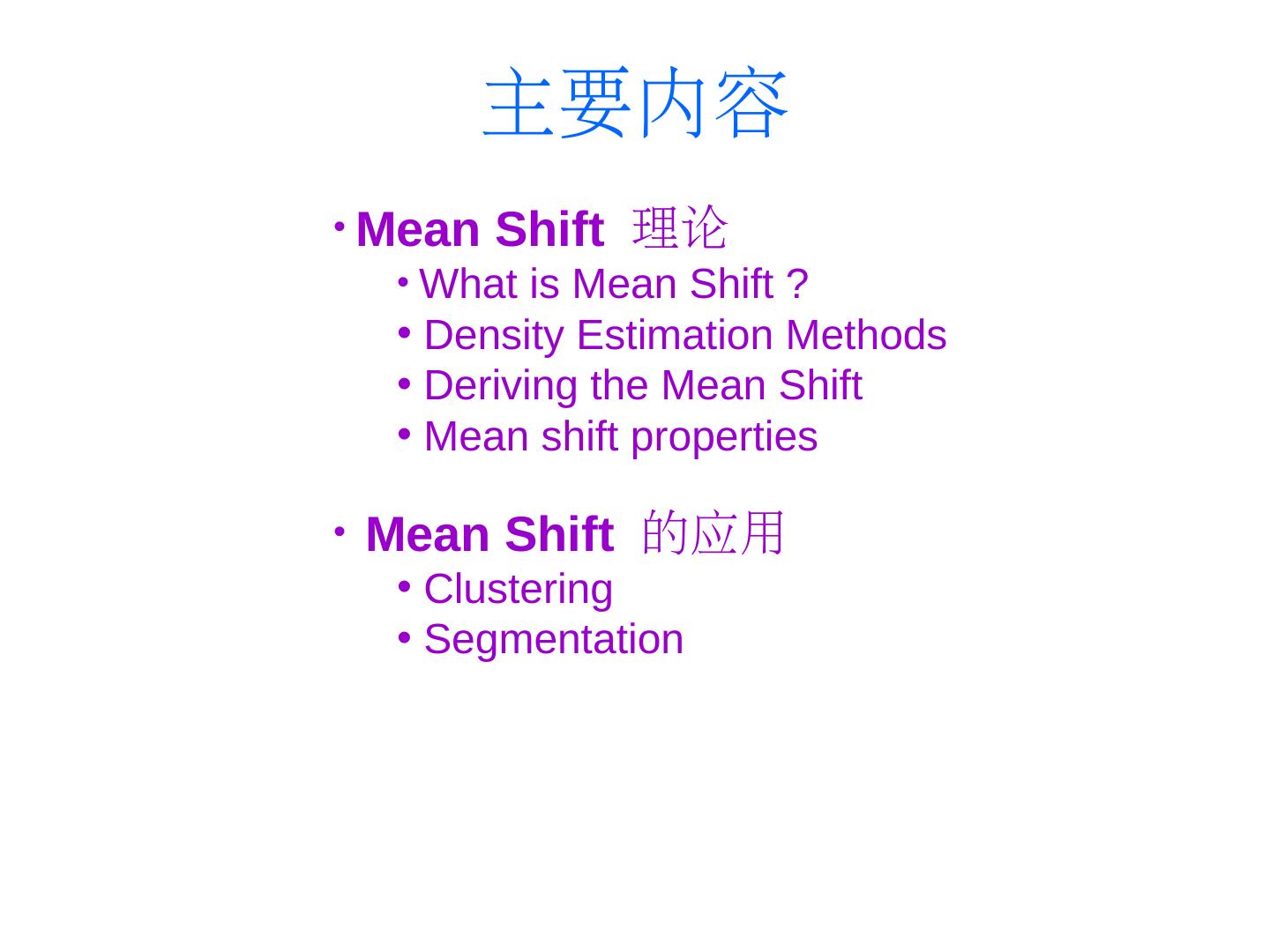 2 . 主要内容 • Mean Shift 理论 • What is Mean Shift ? • Density Estimation Methods • Deriving the Mean Shift • Mean shift properties • Mean Shift 的应用 • Clustering • Segmentation