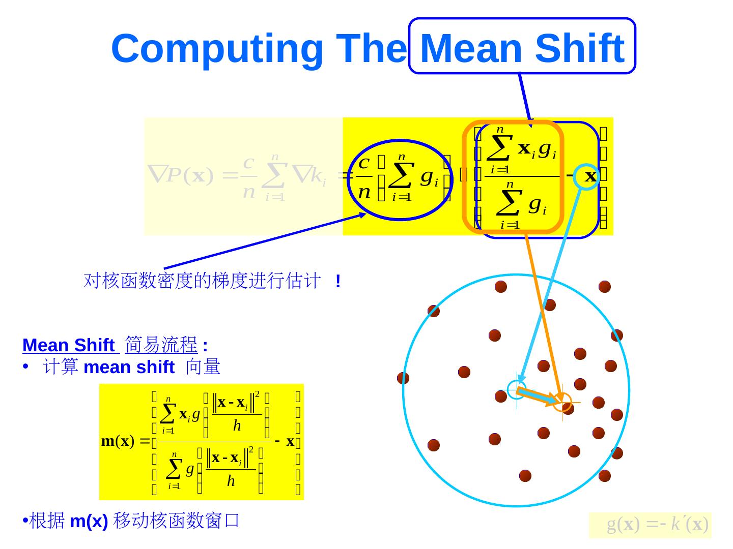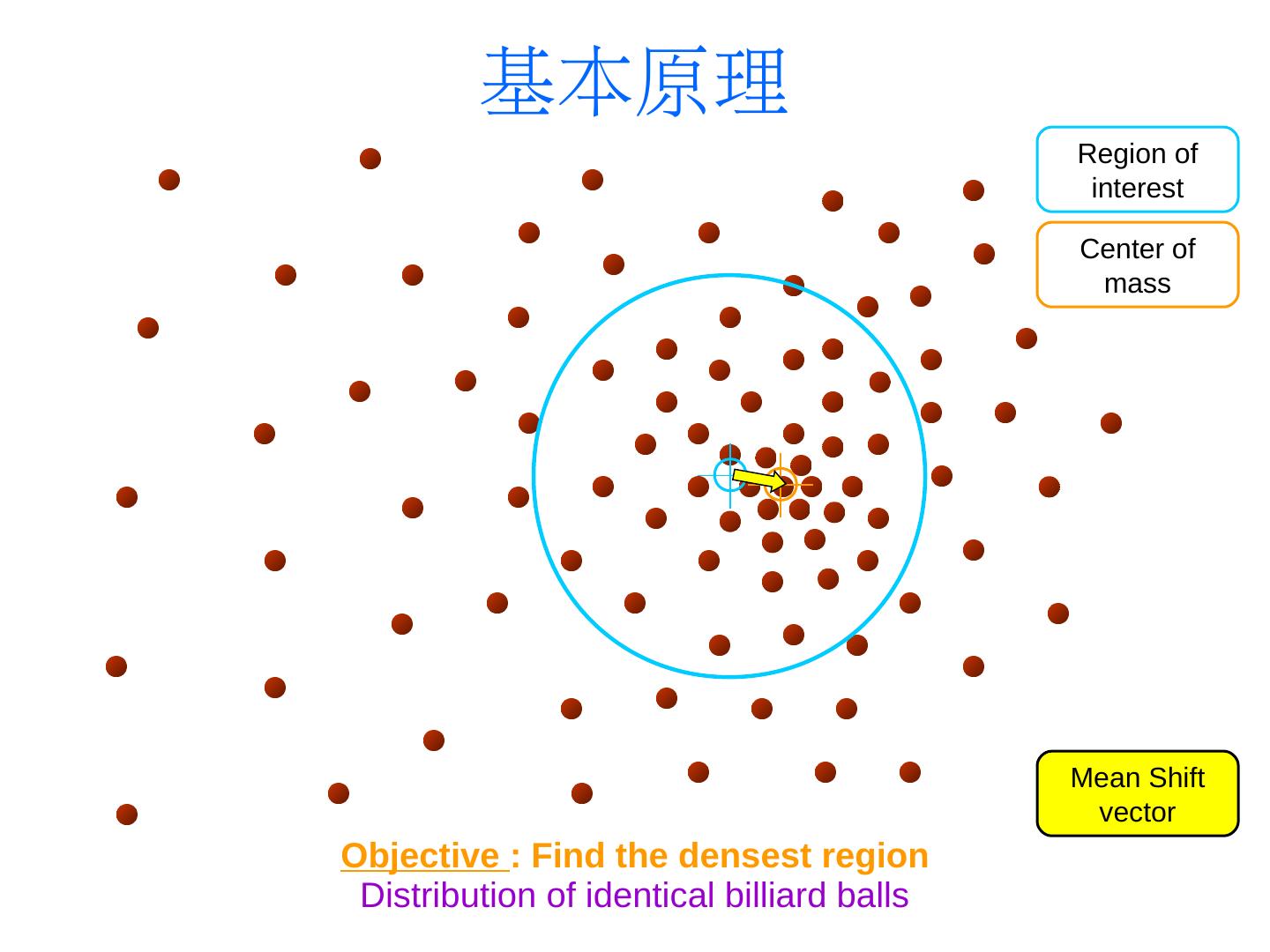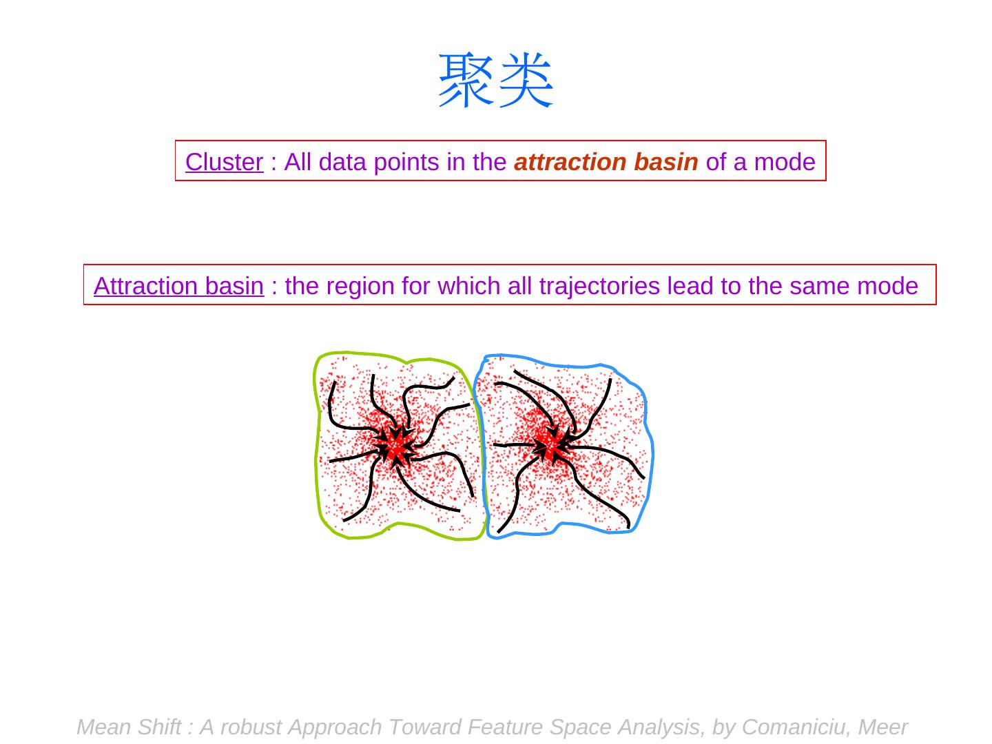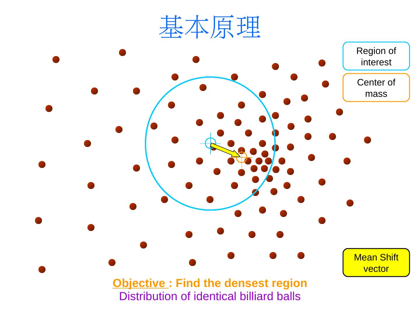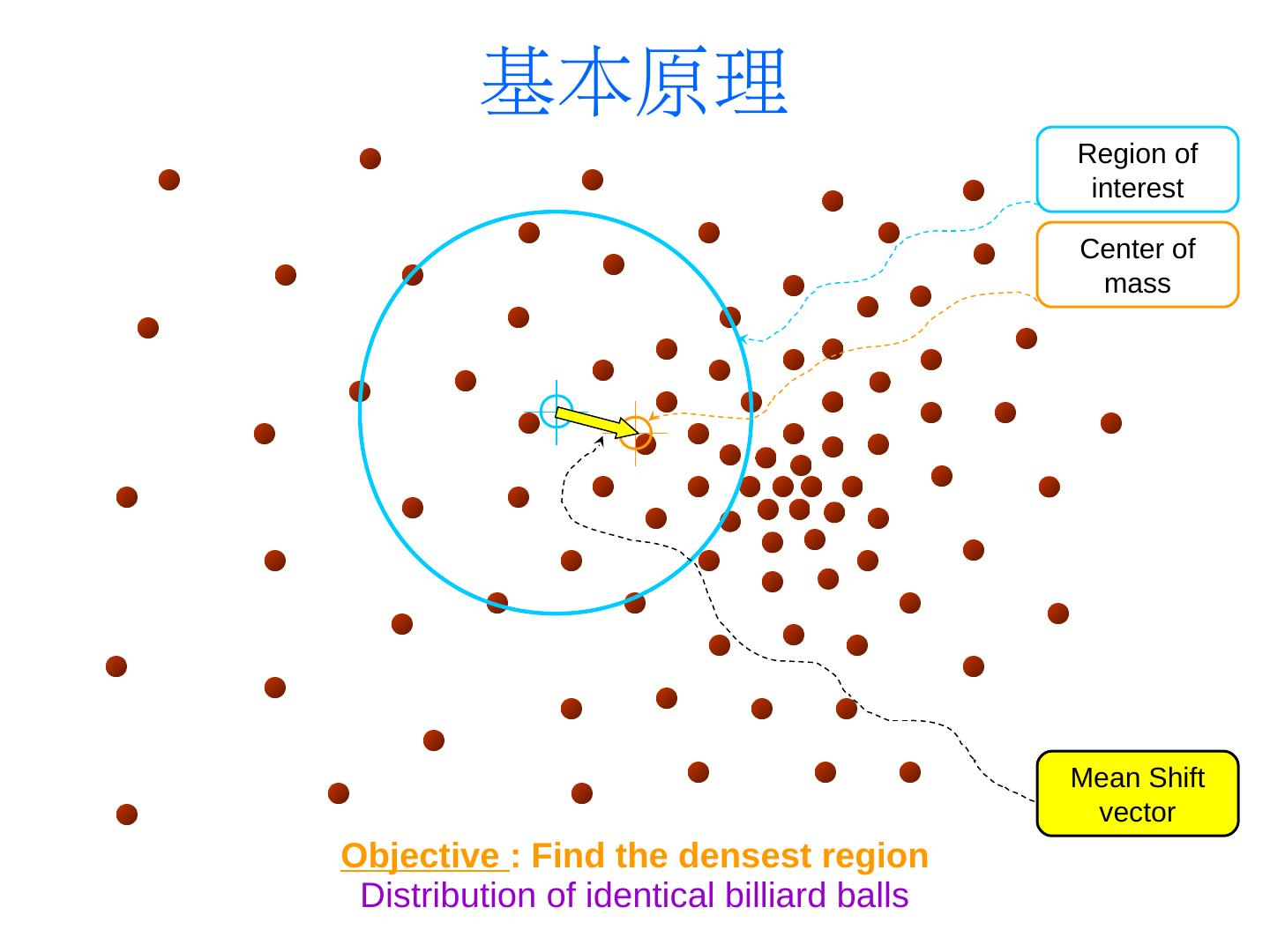 4 . 基本原理 Region of interest Center of mass Mean Shift vector Objective : Find the densest region Distribution of identical billiard balls