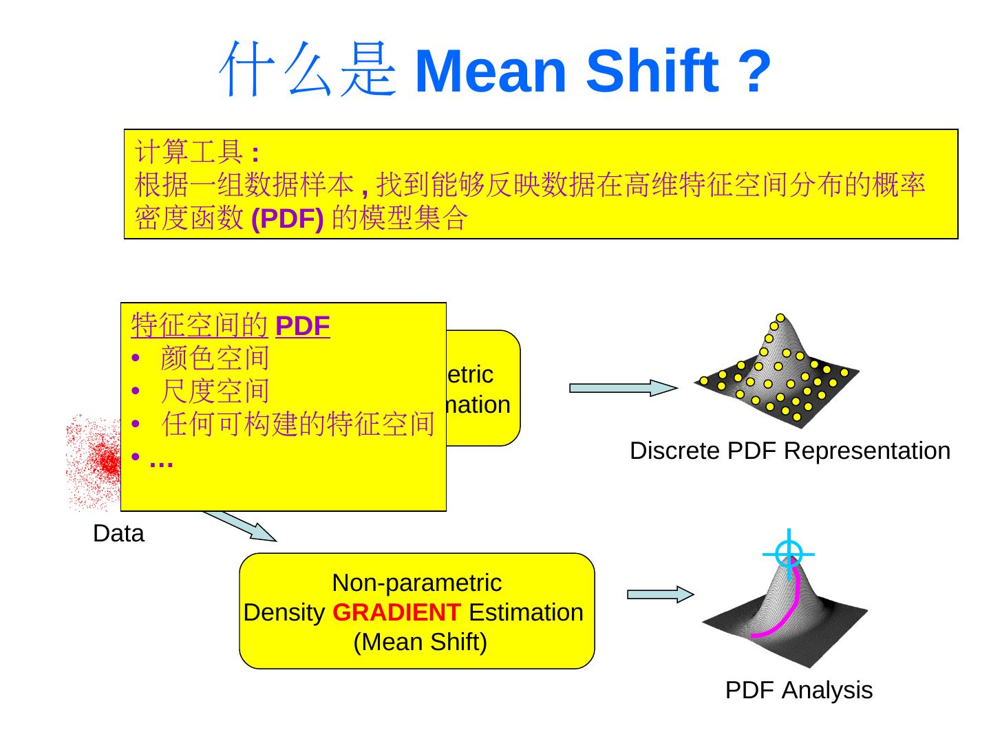 11 . 什么是 Mean Shift ? 计算工具 : 根据一组数据样本 , 找到能够反映数据在高维特征空间分布的概率 密度函数 (PDF)PDF) 的模型集合 特征空间的 PDF • 颜色空间 Non-parametric • 尺度空间 Density Estimation • 任何可构建的特征空间 •… Discrete PDF Representation Data Non-parametric Density GRADIENT Estimation (Mean Shift) PDF Analysis