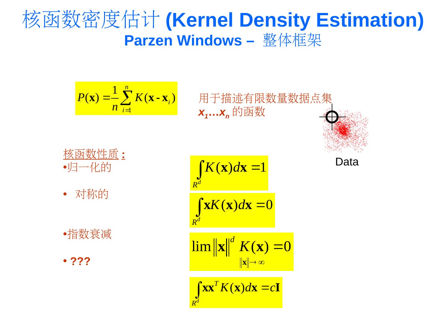 16 .核函数密度估计 (PDF)Kernel Density Estimation) Parzen Windows – 整体框架 1 n P ( x) K ( x - x i ) 用于描述有限数量数据点集 n i 1 x1…xn 的函数 核函数性质 : Data •归一化的 K (x)dx 1 Rd • 对称的 xK (x)dx 0 Rd •指数衰减 d lim x K (x) 0 • ??? x K (x)dx cI T xx Rd