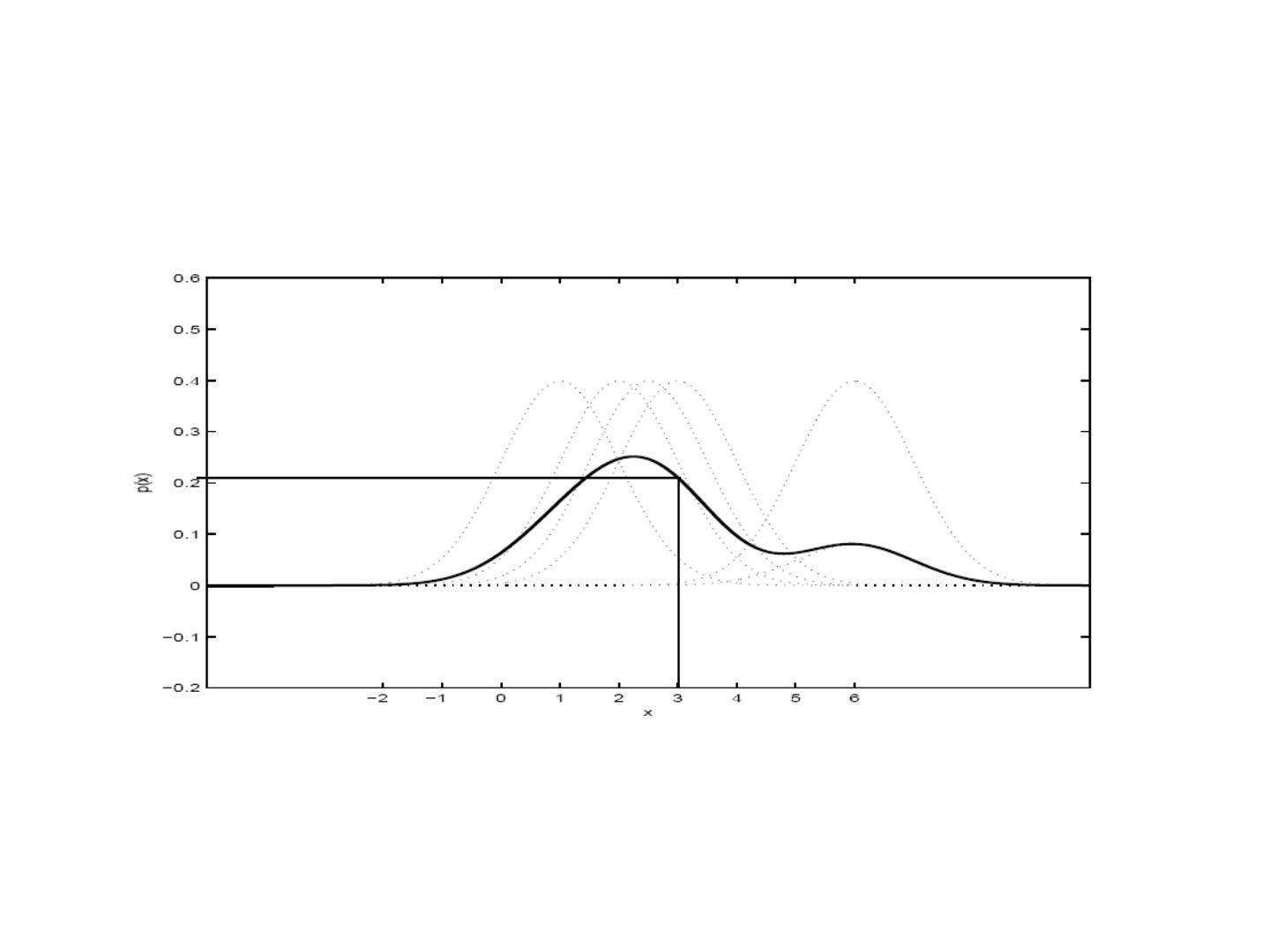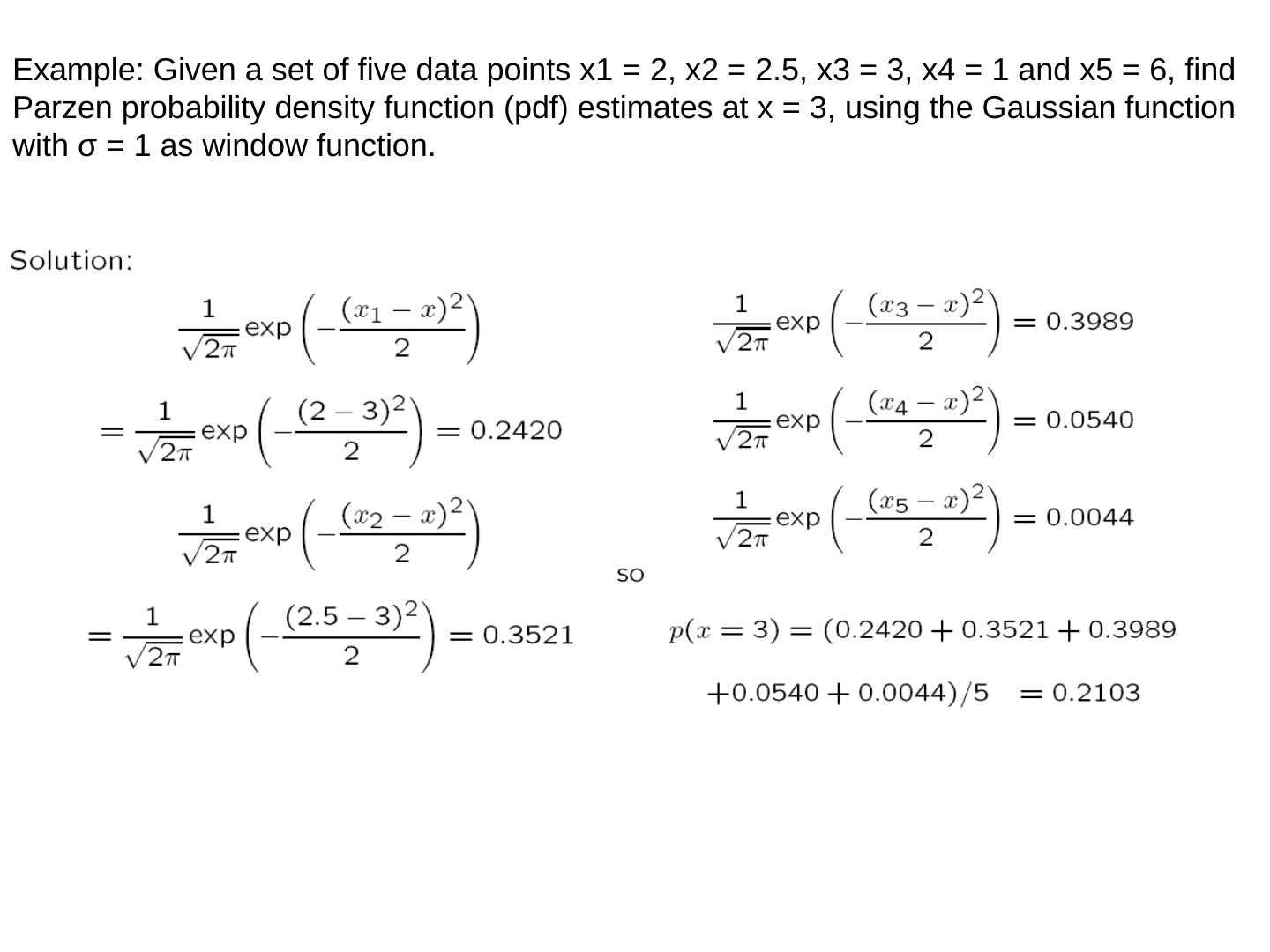 18 .Example: Given a set of five data points x1 = 2, x2 = 2.5, x3 = 3, x4 = 1 and x5 = 6, find Parzen probability density function (pdf) estimates at x = 3, using the Gaussian function with σ = 1 as window function.