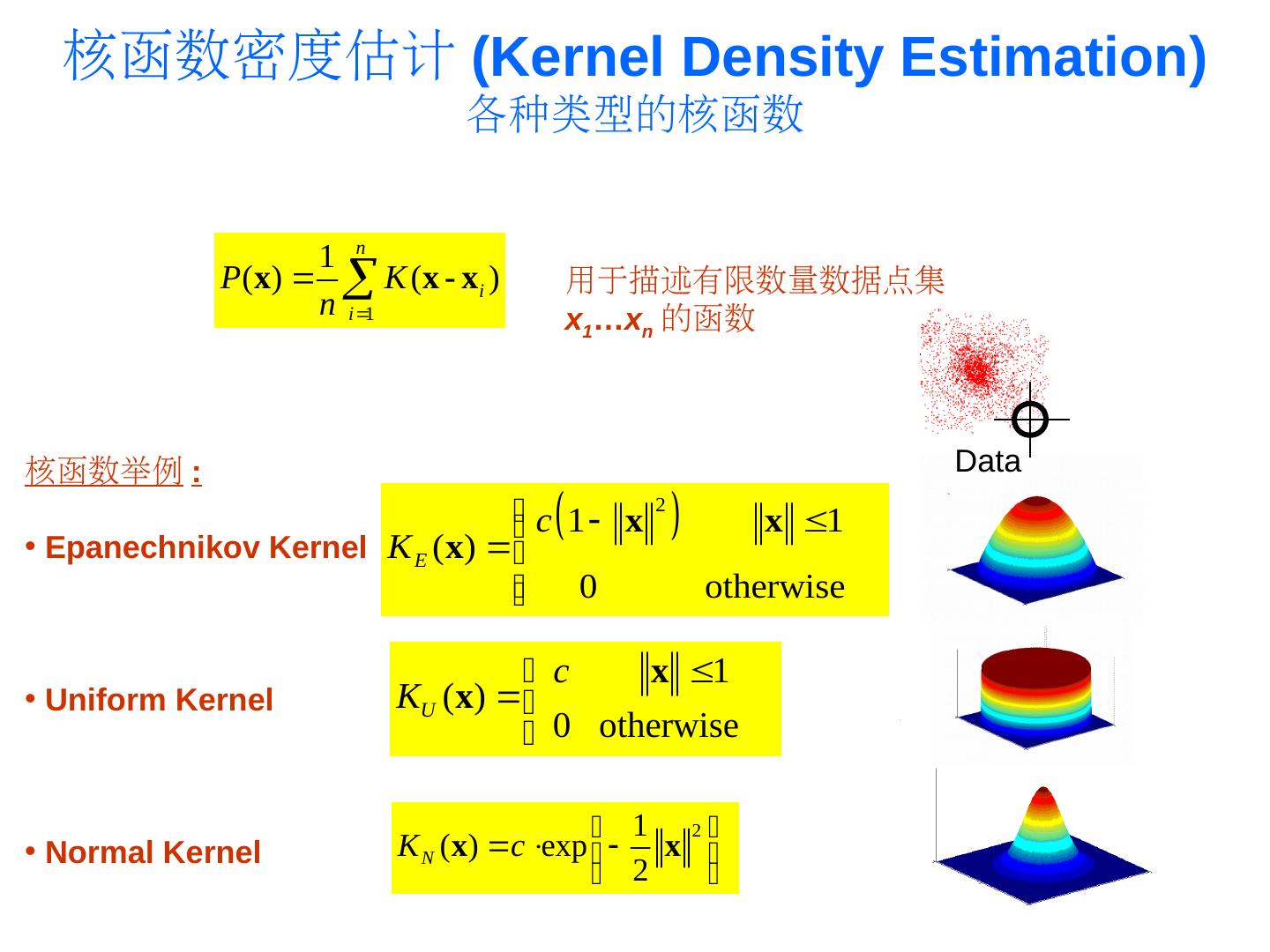 21 . 核函数密度估计 (PDF)Kernel Density Estimation) 各种类型的核函数 1 n P ( x) K ( x - x i ) 用于描述有限数量数据点集 n i 1 x1…xn 的函数 核函数举例 : Data • Epanechnikov Kernel K E (x) c 1 x 2 x 1 0 otherwise c x 1 • Uniform Kernel KU (x) 0 otherwise 1 2 • Normal Kernel K N (x) c exp x 2