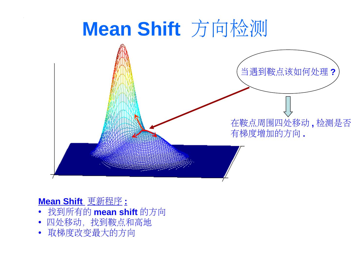25 . Mean Shift 方向检测 当遇到鞍点该如何处理 ? 在鞍点周围四处移动 , 检测是否 有梯度增加的方向 . Mean Shift 更新程序 : • 找到所有的 mean shift 的方向 • 四处移动,找到鞍点和高地 • 取梯度改变最大的方向